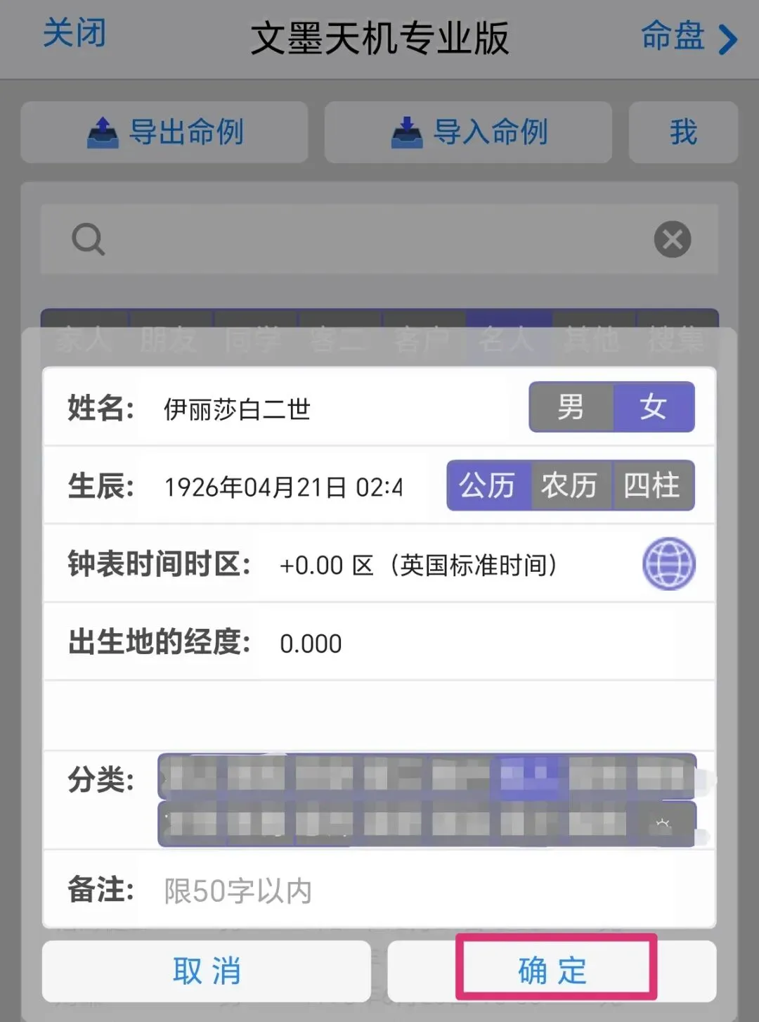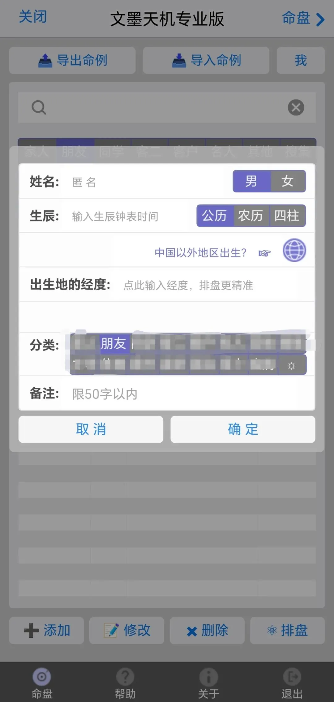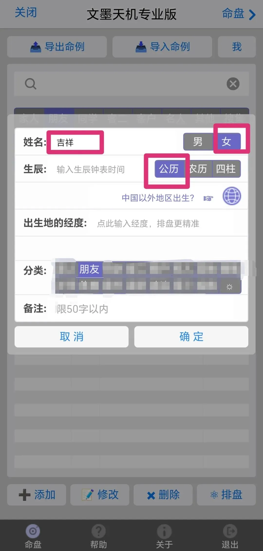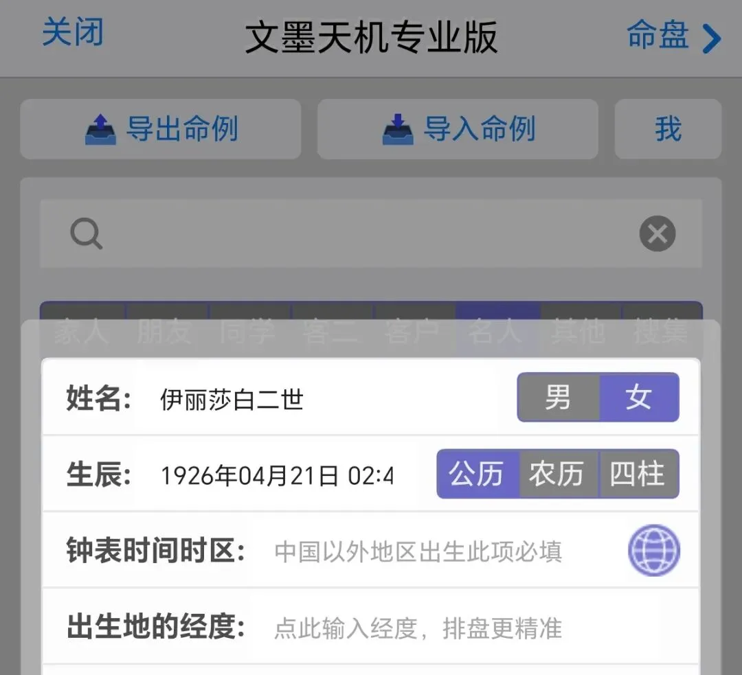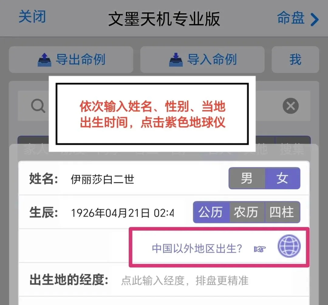 点击命例,在基本信息输入界面依次输入信息,时间就用当地出生的时间,国外出生的点击紫色小地球。