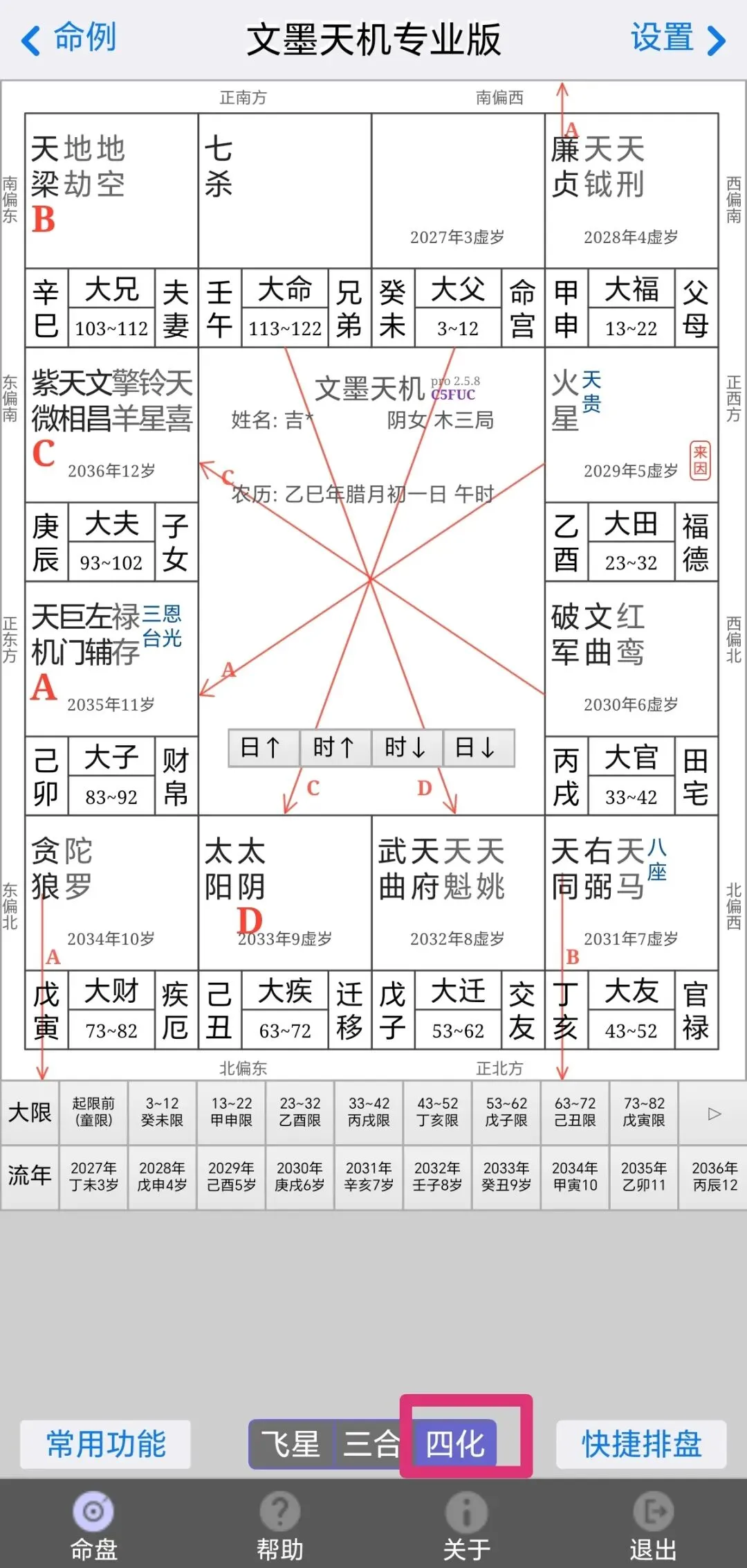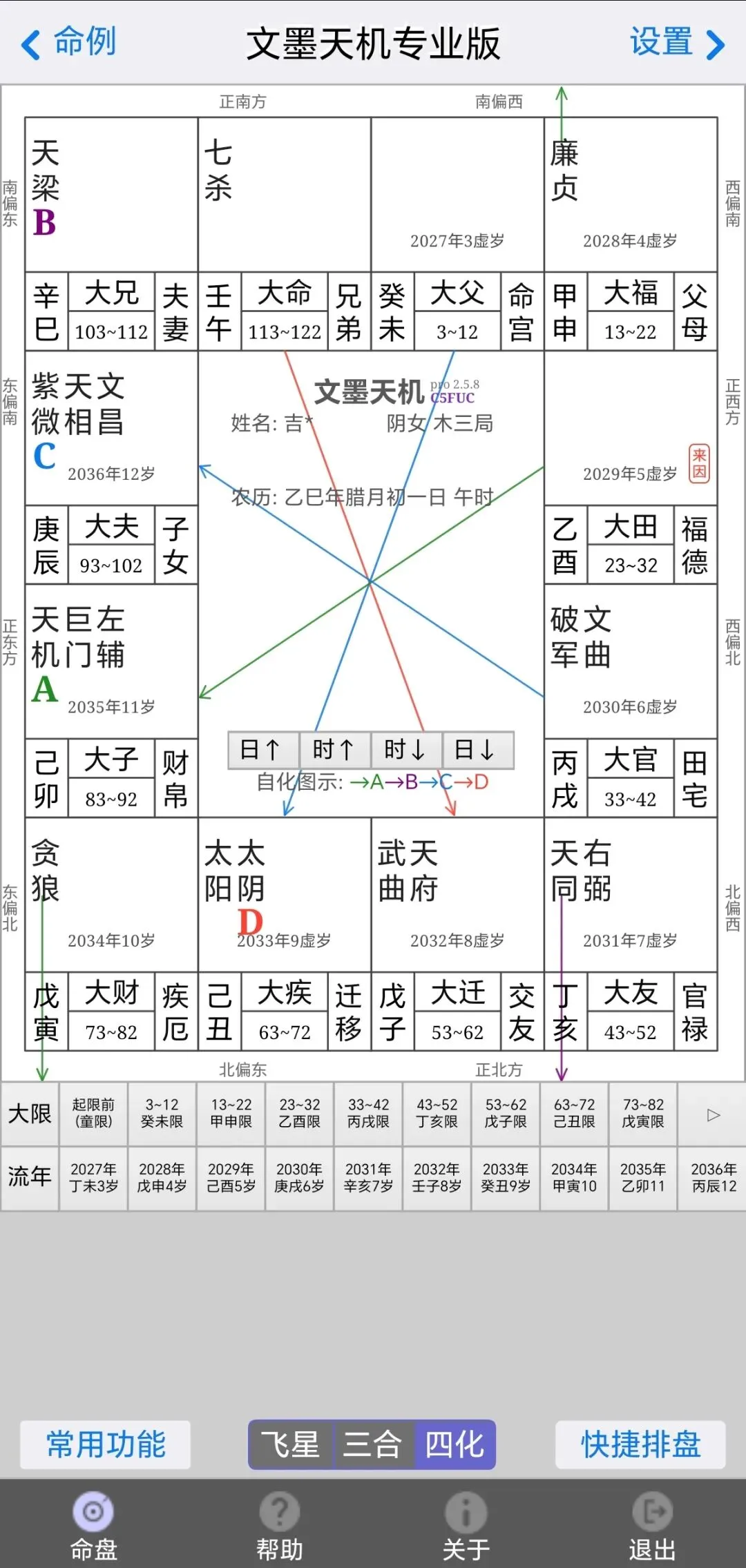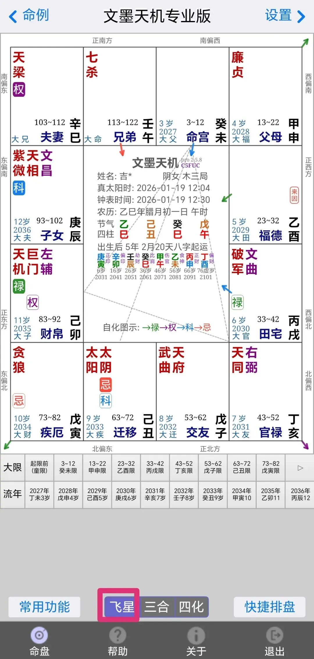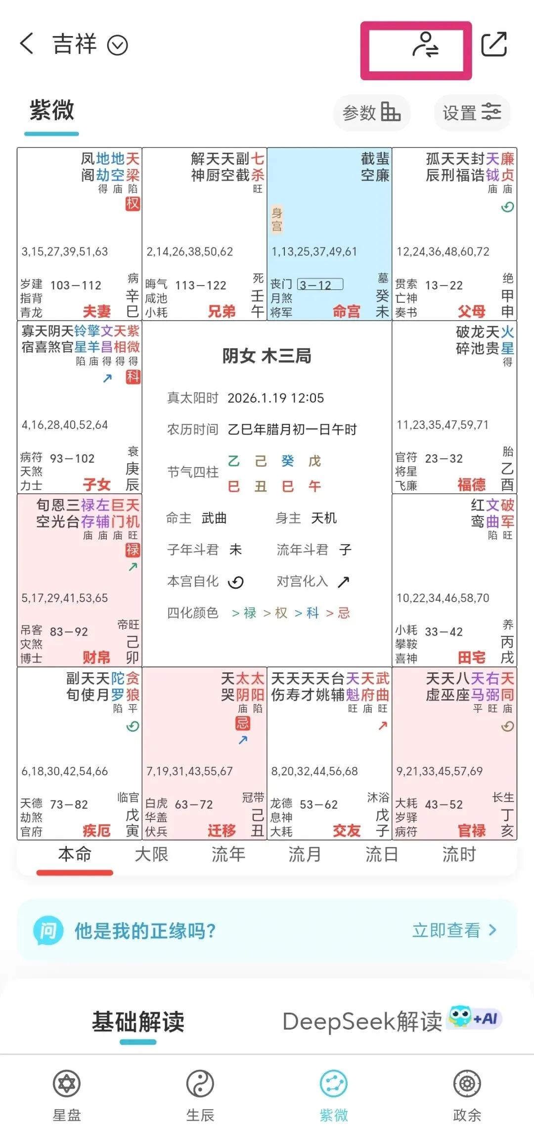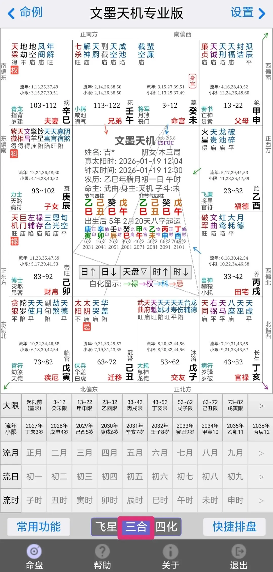 4、得到紫微斗数盘。默认跳出来的是三合盘,可以根据底部按钮选择所需要类型的盘。