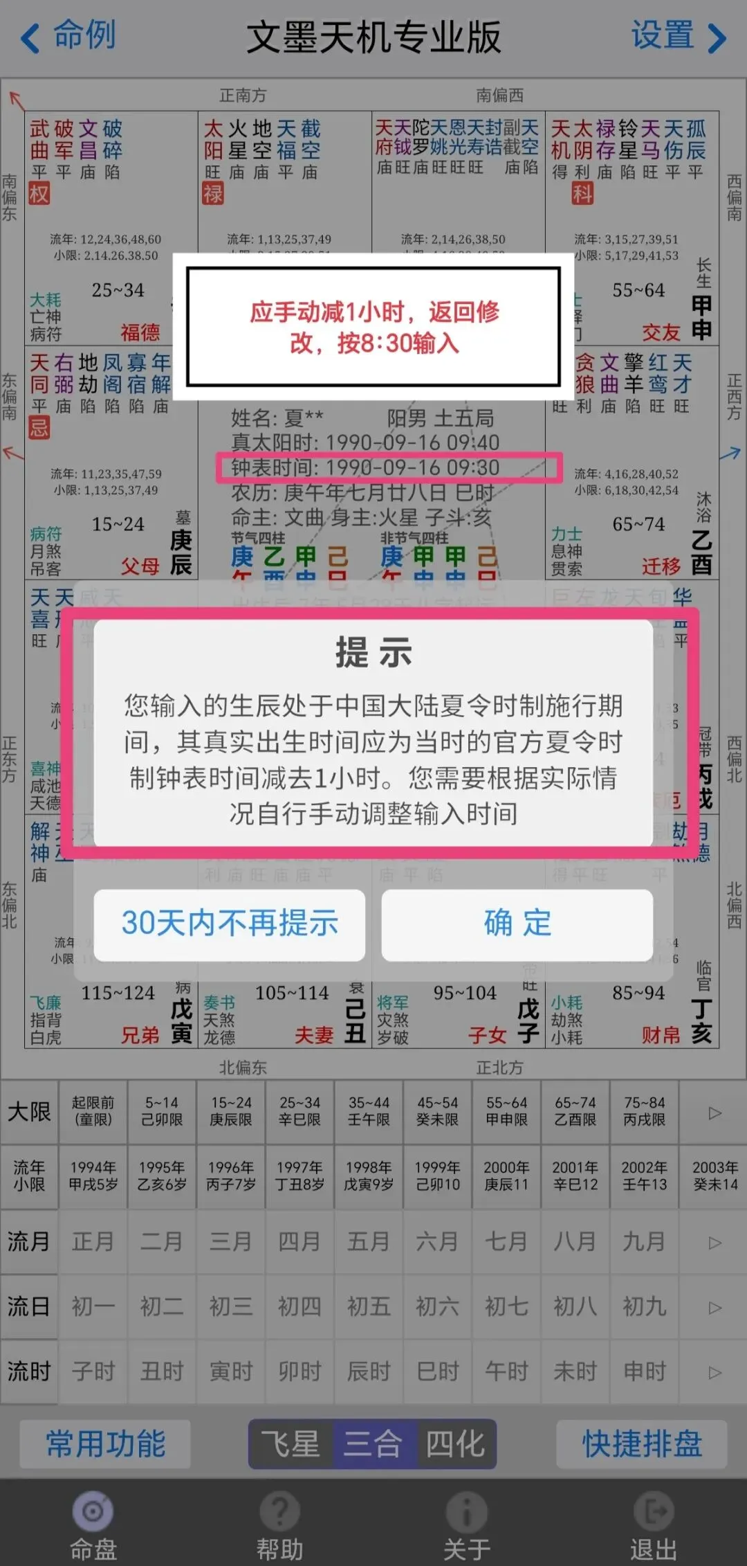 例如上个时间的排盘,按夏令时时间输入,软件提示如下: