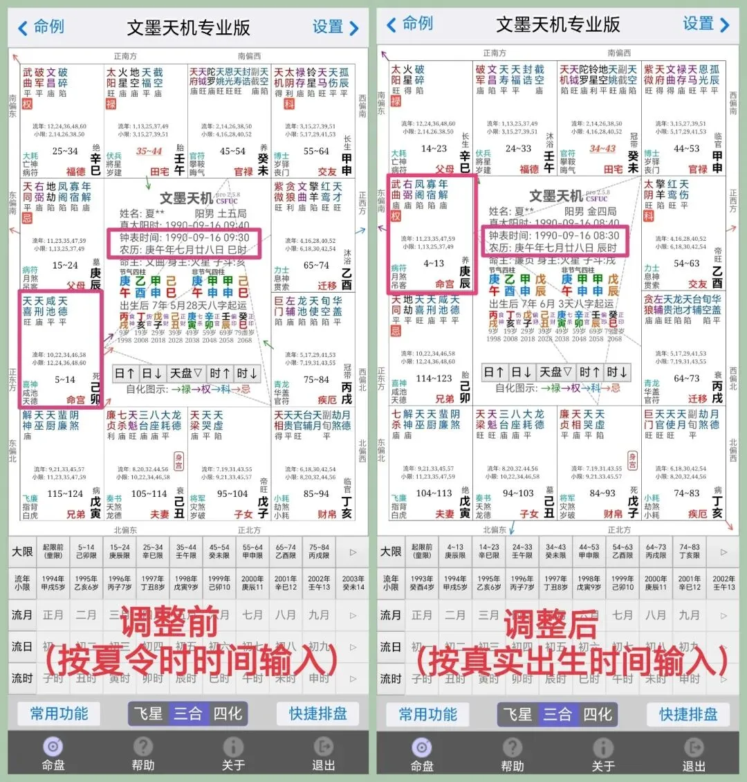比如刚才这个夏令时出生的上海的男生,按照减1小时的出生时间输入,得到的盘就是右边调整后的盘。