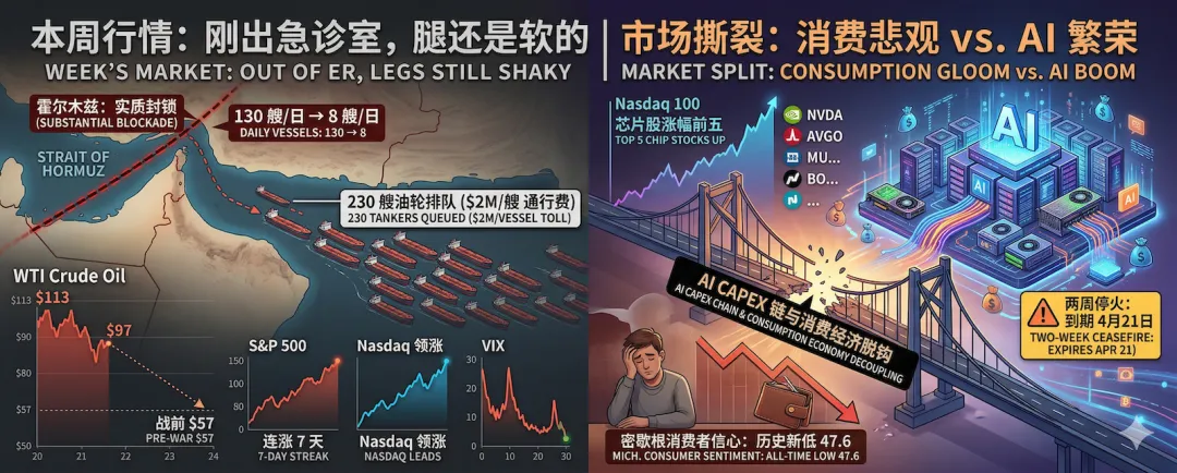 周一霍尔木兹最后通牒到期前两小时达成停火,市场松了一口大气:S&P 500 连涨 7 天,VIX 从 30+ 跌破 20,Nasdaq 本周领涨。但这是一个"有保质期的利好"——两周停火期到 4 月 21 日,伊斯兰堡谈判正在此刻进行。海峡名义开放、实质封锁:日均通航从 130 艘降到了 8 艘,伊朗在收 $2M/艘的"保护费",230 艘油轮还在排队。WTI 从 $113 跌到了 $97,但离战前的 $57 还差一个世界。