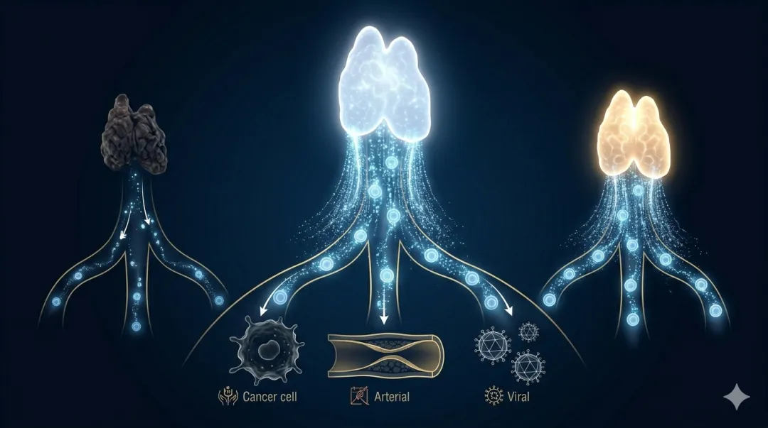 胸腺是T细胞的「出厂地」。免疫治疗(PD-1/PD-L1抑制剂)的本质,是解除对T细胞的抑制,让它去攻击肿瘤。但如果胸腺已经严重退化,T细胞库贫乏,多样性不足——