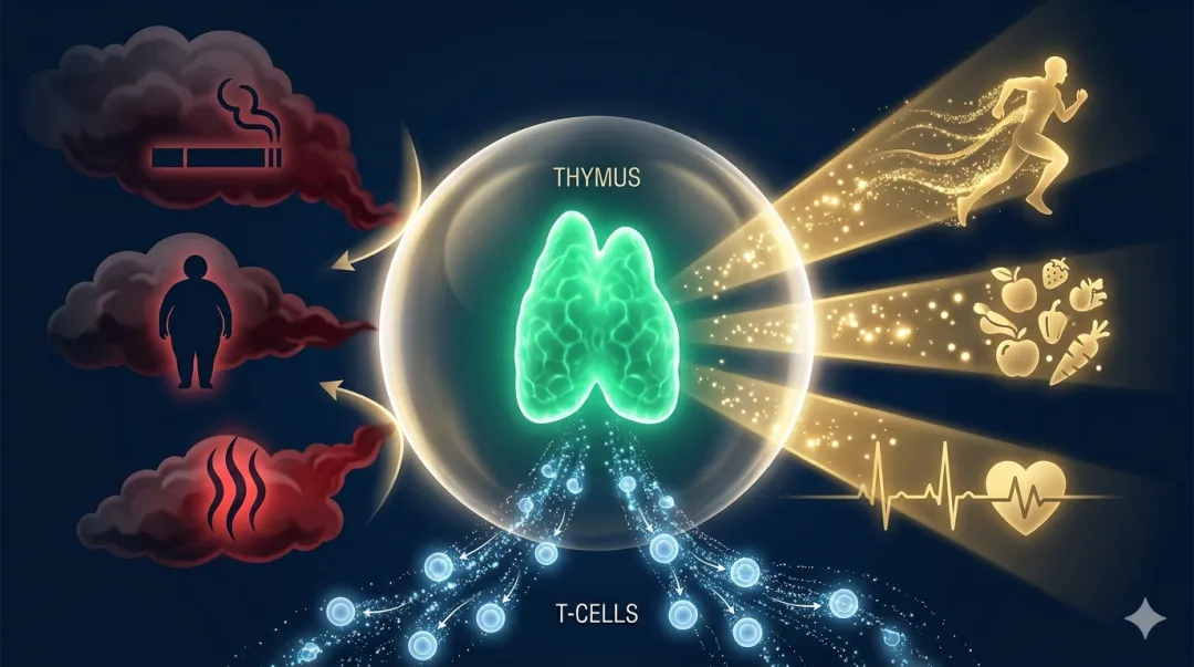 研究明确发现,与胸腺健康负相关的因素包括:吸烟年限和强度(关联极强)、BMI升高(肥胖)、高血糖、高甘油三酯、高血压;与胸腺健康正相关的因素包括:规律体力活动、高HDL胆固醇、良好代谢指标。