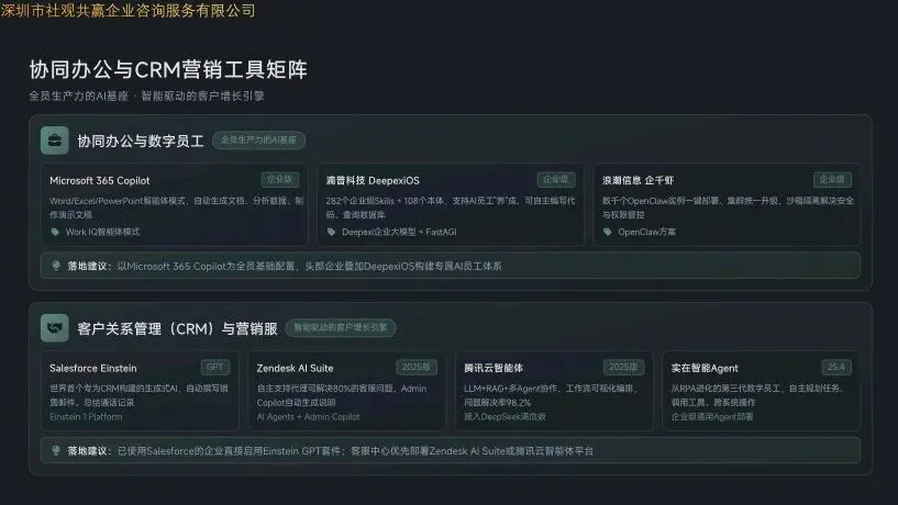 落地建议:已使用Salesforce的企业直接启用Einstein GPT套件;客服中心优先部署Zendesk AI Suite或腾讯云智能体平台。