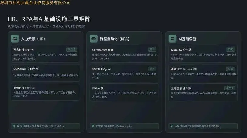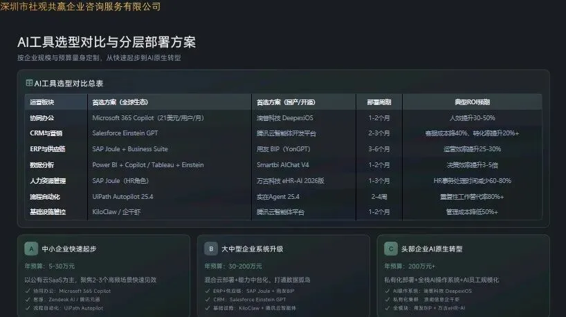 结语:工具是起点,战略是终点,本方案为企业提供了从 “Microsoft 365 Copilot for Business”到“浪潮信息企千虾” 、从 “Salesforce Einstein GPT”到“万古科技eHR-AI 2026” 的全栈工具地图。工具选型只是AI转型的“第一公里”,真正的竞争力源于将上述工具系统化地嵌入业务流程、与数据资产深度融合、并以组织能力为保障,建议即刻启动“AI工具选型评估工作组”,结合本方案的工具全景图,基于企业自身的数据基础、IT能力和预算规模,制定为期6-18个月的AI工具落地路线图,抢占“人+AI”共生时代的战略先机。