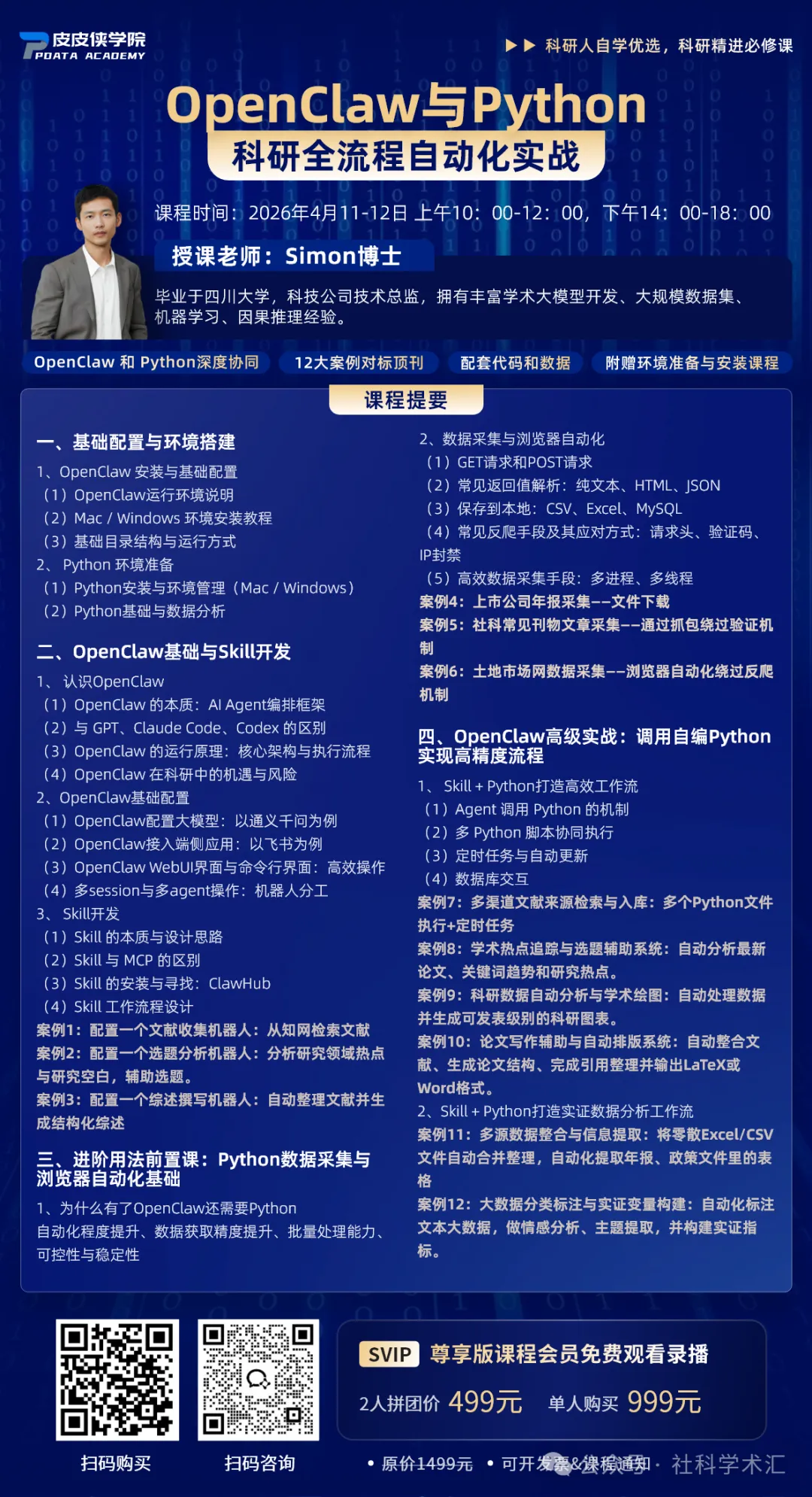 本课程从环境搭建到高级实战,层层递进讲解 OpenClaw 与 Python 的核心操作,帮助不同基础的科研人员打破技术壁垒,构建科研自动化能力。内容贯穿文献收集、选题分析、数据采集、实证分析、论文写作与排版的全流程,12 个实战案例贴合实际研究需求,涉及的 Skill+Python 协同工作流、大数据分类标注、多源数据整合等方法紧跟顶刊趋势,帮助学员在研究中实现技术创新,提升论文的学术质量和发表。