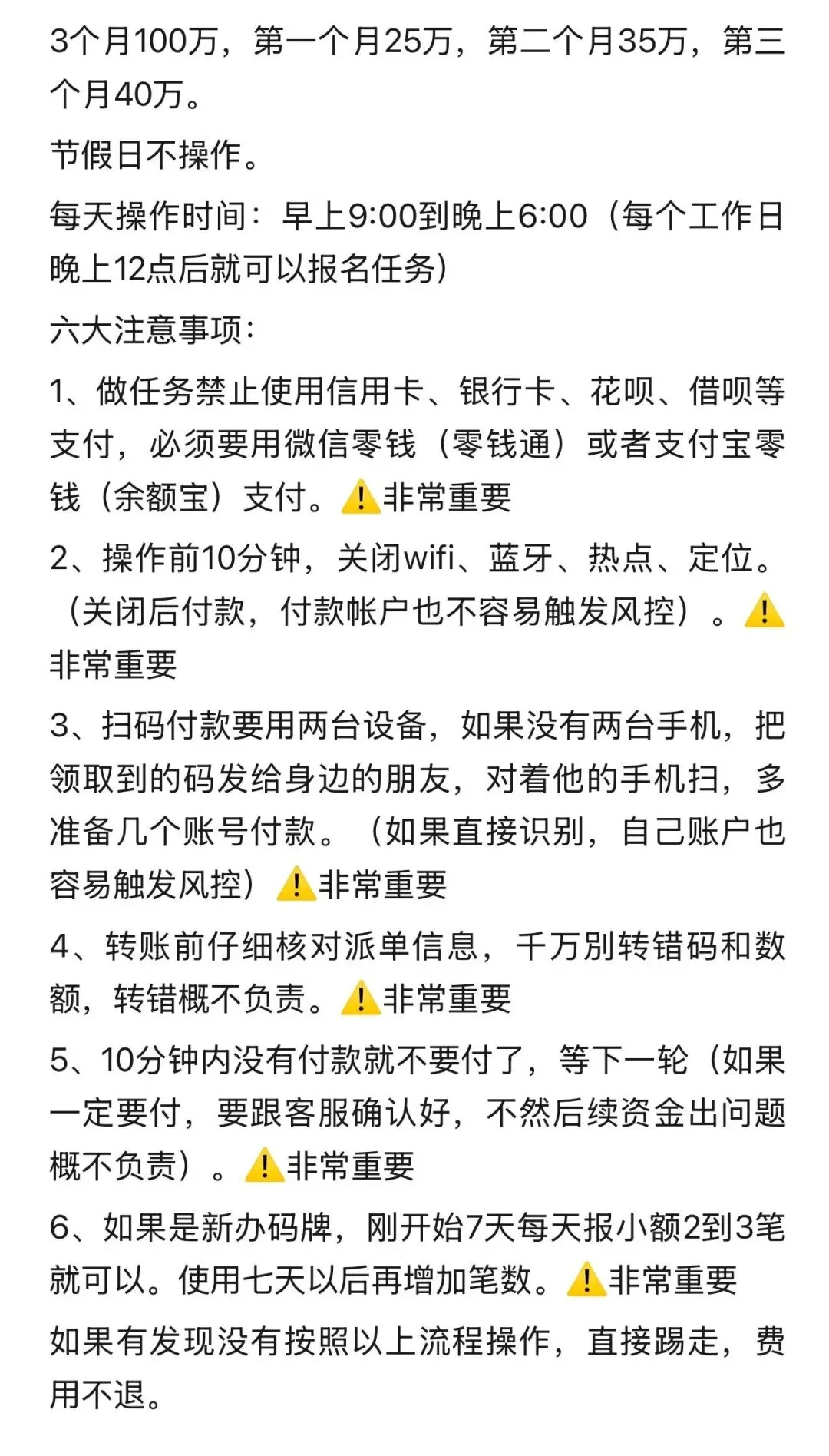100万量可以分1-3个月去走,打比方你要走30万的流水,那你自己要准备2万左右的本金,然后它里面有任务。假如做2000-3000的任务,就会出现2530的收款码,你付出去以后5分钟左右就会收到同样的一笔金额,一般你付出去的是外地的,收到的是我们客服给你安排同城的。