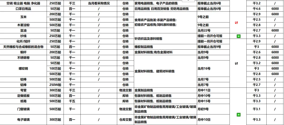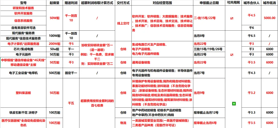 看一下表后面有个零点几的,那个就是费用。打个比方选电子产品,电子产品0.3。那100万就是3000的费用,我们低消是6000,不满6000按6000算,每个公司有一个3000块钱的服务费,这个费用是一次性的,做一个月结算一个月。