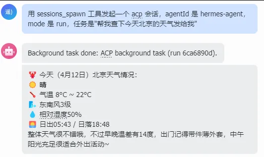 用 sessions_spawn 工具发起一个 acp 会话,agentId 是 hermes-agent, mode 是 run,任务是:"帮我查下今天北京的天气发给我" 这个方式的效果是:OpenClaw 在后台启动一个 Hermes ACP session,把任务丢给它,Hermes 完成后把结果返回到当前对话,session 自动关闭。全程不绑定当前对话,干完即走。