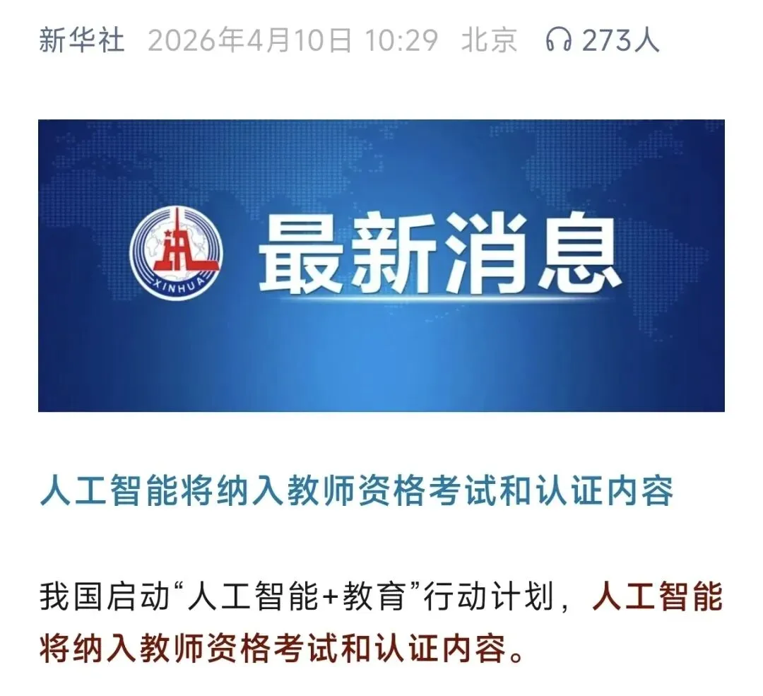 2026年4月10日,教育部正式宣布:人工智能将纳入教师资格考试和认证内容。