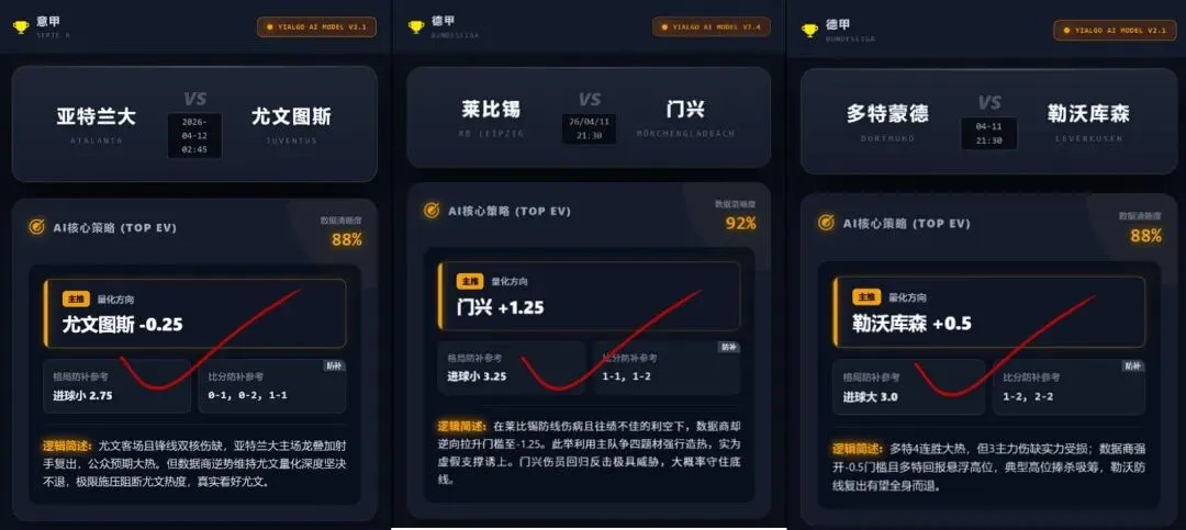【回顾内容】昨天核心策略7场收获3红。Yi-Algo AI 成功识别尤文与门兴面临的深度诱导,其中尤文更是完美命中0-1比分斩获三项红,还有勒沃库森也成功预判方向顺利拿下,展现了极强的风控与卡位避险功力。但在防线重组及单边预期极端的赛事中遭遇了意外偏离,如皇家社会与AC米兰的失控表现均超出常规防线预期。后续,Yi-Algo AI量化分析模型将针对极端战意不对称及突发伤病引发的数据断崖崩盘特征,进一步优化相关降权权重。