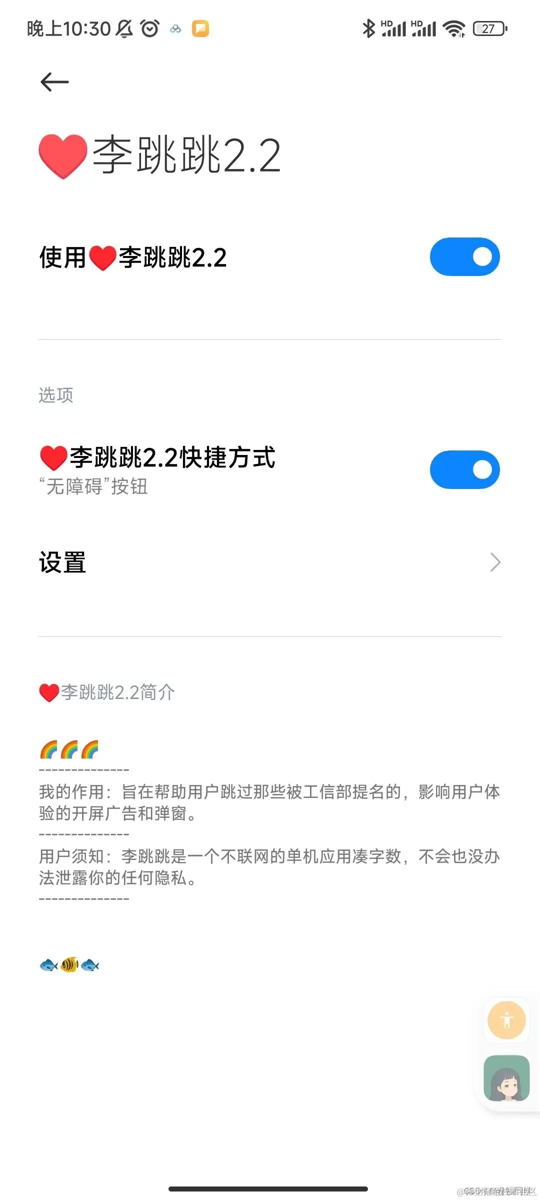 目前测试下来,李跳跳2.2版本能稳定运行,较新的2.6版本反而在安卓机上开启不了无障碍功能,推荐大家使用2.2版本,获取地址: