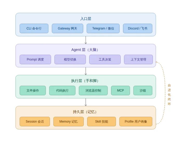 Session:会话记录,支持跨平台同步 Memory:长期记忆,用 SQLite FTS5 做全文搜索,加上 LLM 摘要做跨会话回忆 Skill:技能文档,遵循 agentskills.io 开放标准,跨 Agent 兼容 Profile:用户画像,集成了 Honcho 辩证用户建模,它会持续理解你是谁、你的偏好是什么