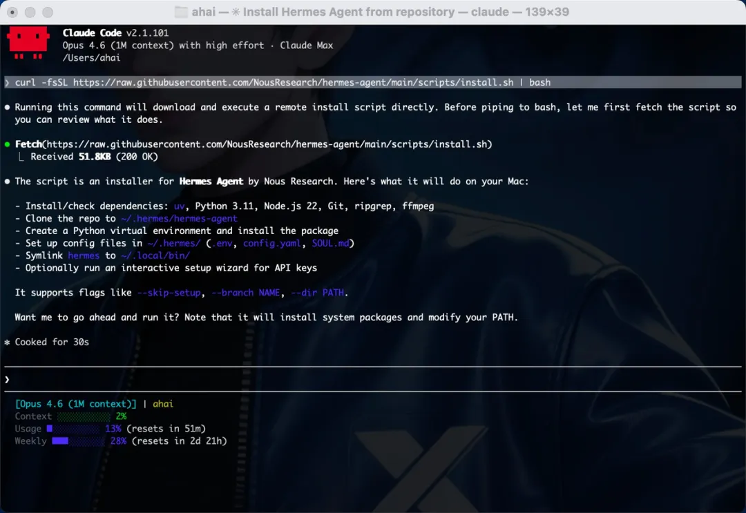 curl -fsSL https://raw.githubusercontent.com/NousResearch/hermes-agent/main/scripts/install.sh | bash
