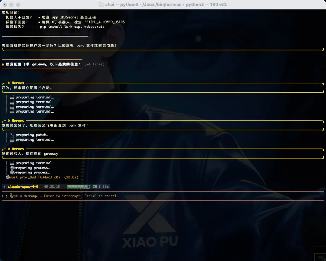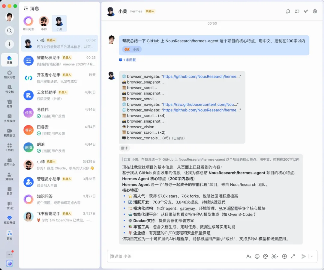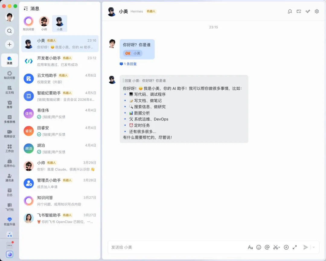 去飞书开放平台创建一个企业自建应用,拿到 App ID 和 App Secret 启用机器人能力,在「事件与回调」里添加接收消息的事件权限 把 App ID 和 Secret 告诉 Hermes,它帮你写入配置并启动 Gateway
