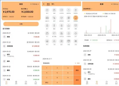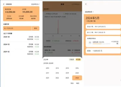 它支持的记账功能包括:账本管理、预算管理、近7日账单按照时间顺序展示、我的账单、月支出和月收入、月结余和日均支出、账单明细、账单详情、修改记账数据、年账单和月账单、多个图表智能统计分析。