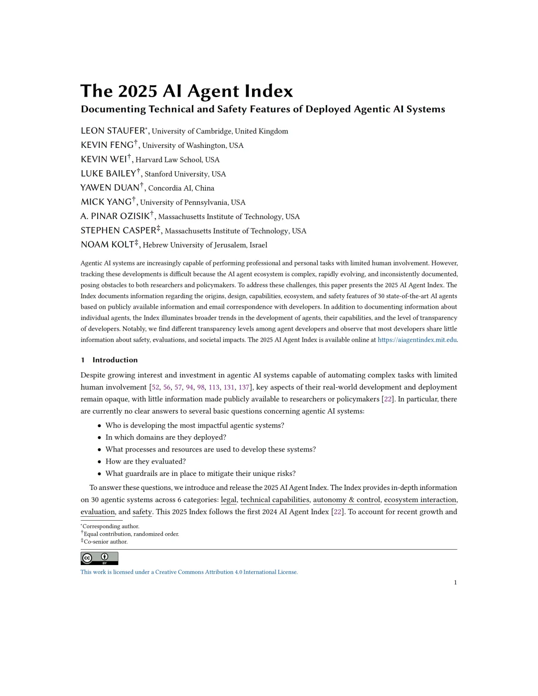 本报告(The 2025 AI Agent Index)是由麻省理工学院、剑桥大学、斯坦福大学等多所顶尖学术机构的研究者联合发布的一份权威性调研文件。它旨在应对AI智能体(Agentic AI Systems)生态系统的复杂性、快速演进和信息记录不一致等问题,通过系统性地索引30个顶尖的、已部署的AI智能体,为研究人员、政策制定者和行业提供清晰的生态图谱与透明度评估。