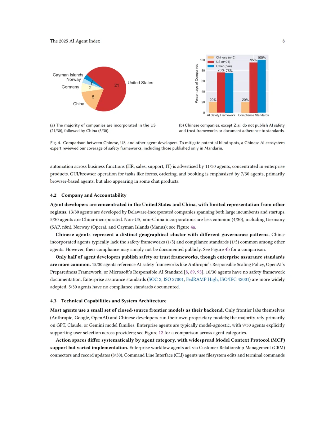 深度依赖与权力集中:几乎整个索引中的智能体都依赖于美国或中国的少数几家前沿实验室提供的基础模型。这创造了单点故障风险(如服务中断、价格变动、安全退化)。