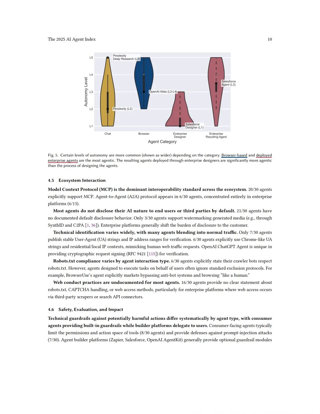 对网络规则的挑战:以Perplexity Comet为代表的浏览器智能体常常忽略robots.txt协议,其设计甚至宣传“可绕过反机器人系统”。开发者的辩护逻辑是“智能体代表用户行动,因此应继承用户的权限”。这引发了与网站运营者的激烈冲突(报告中提到了亚马逊等公司的诉讼)。ChatGPT Agent是索引中唯一使用加密请求签名(RFC 9421)的系统,这为验证和审计提供了可能,但也凸显了整个生态在身份验证和问责机制上的普遍缺失。