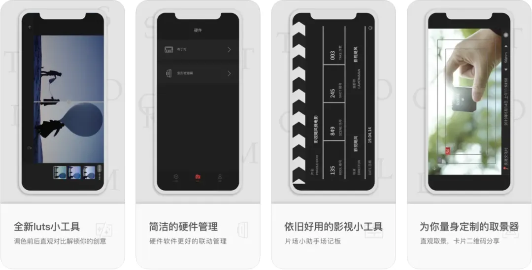 实用拍摄工具,包括取景器、场记板、绿幕、LUTS、手机飓风灯、布丁灯、变形宽银幕等功能。