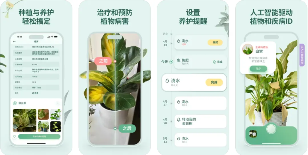 识别三万多种植物、花卉、多肉植物和树木,基于植物品种和花盆尺寸,获得定制化的浇水建议有关浇水、修剪、施肥、温度等详细的植物养护信息!