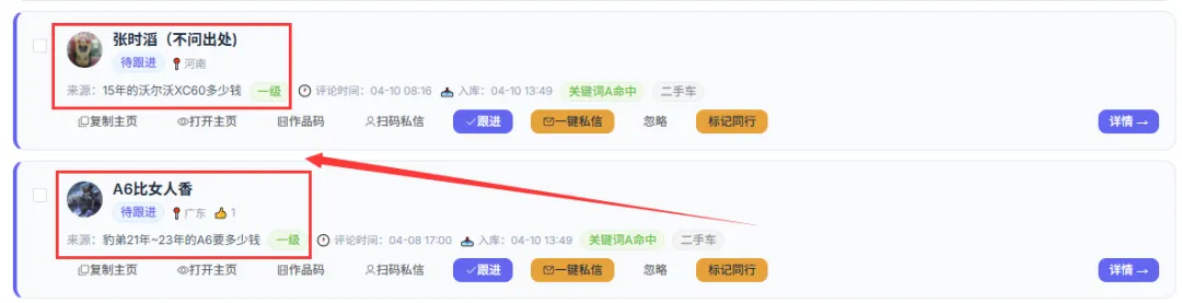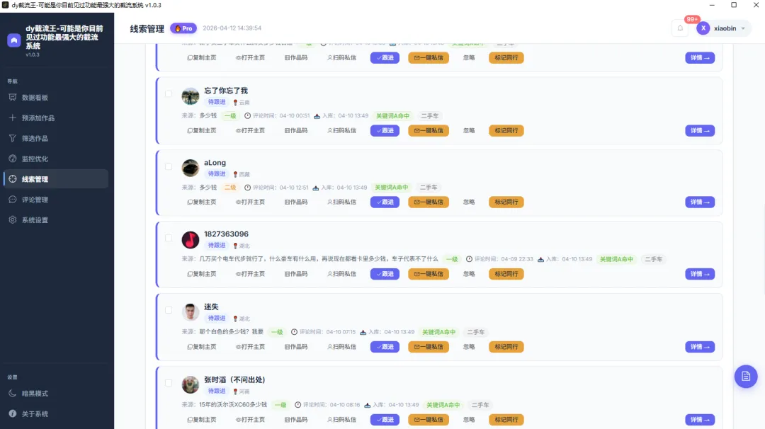 如果你的流量承接能力很强,或者是团队操作,想要每天几百个客户,就需要专业工具。我们团队自研的这款抖音评论截流软件,操作非常简单,设置好关键词后,它会自动监控同行视频的评论区,一旦评论里出现你设定的意向词(比如“多少钱”“怎么买”“求带”),软件就会自动采集这条客户线索。另外,软件也支持指定监控某个作者或某个具体作品的评论区。用上这款软件,每天加上几百个精准客户,确实是件轻松的事。设置好软件后,它会自动跑到二手车相关视频的评论区。只要有人问类似“15年的沃尔沃XC60多少钱?”“豹弟21年~23年的A6要多少钱?”这样的问题,软件立刻把这条评论抓下来。这种直接问价的用户,成交意愿非常强。我们自己行业实测,截流来的客户转化率在35%以上,有些行业甚至更高。好了,关于抖音自动获客截流的内容就和大家分享到这里,想要这块软件使用,可以添加我的账号:Lian7635 备注:截流,免费送测试卡使用,帮你解决精准获客的难题!