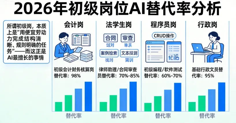 2026年,初级会计财务核算岗替代率已达98%,基础行政文员替代率达95%,律师助理、合同审查员替代率达70%到85%,初级编程和软件测试替代率达60%到70%。
