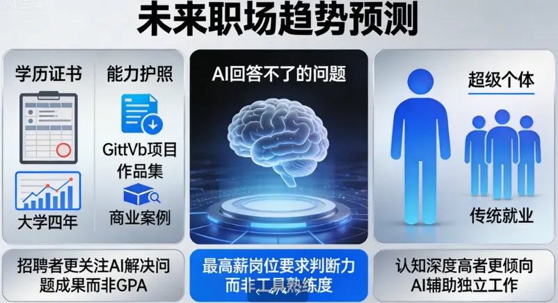 其一,"能力护照"会比"学历证书"更有说服力。招聘者看的不是你读了四年什么,而是你用AI解决了什么问题、产出了什么结果。GitHub上的项目、公开的作品集、可验证的商业案例——这些将比GPA更有说服力。