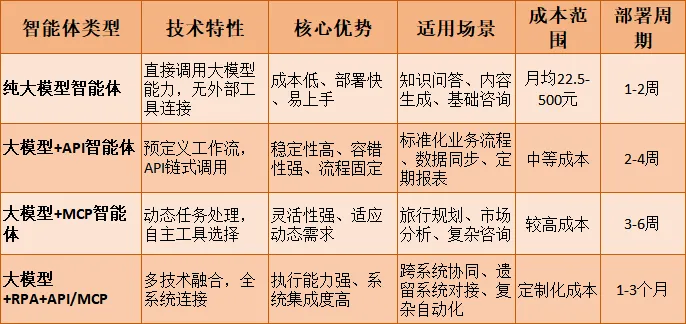 比如某服装电商接入腾讯混元API月均节省6000元人力成本,某物流企业引入AI调度系统年节省成本400万元。智能体方面,有四种类型:纯大模型智能体、大模型+API智能体、大模型+MCP智能体、大模型+RPA+API/MCP智能体。选型指南也有详细内容。