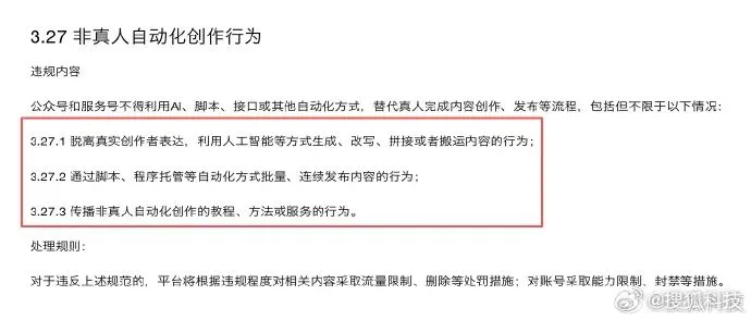 值得注意的是,微信公众号近日新增“非真人自动化创作行为”规则,明确规定:公众号和服务号不得利用AI、脚本、接口或其他自动化方式,替代真人完成内容创作、发布等流程。