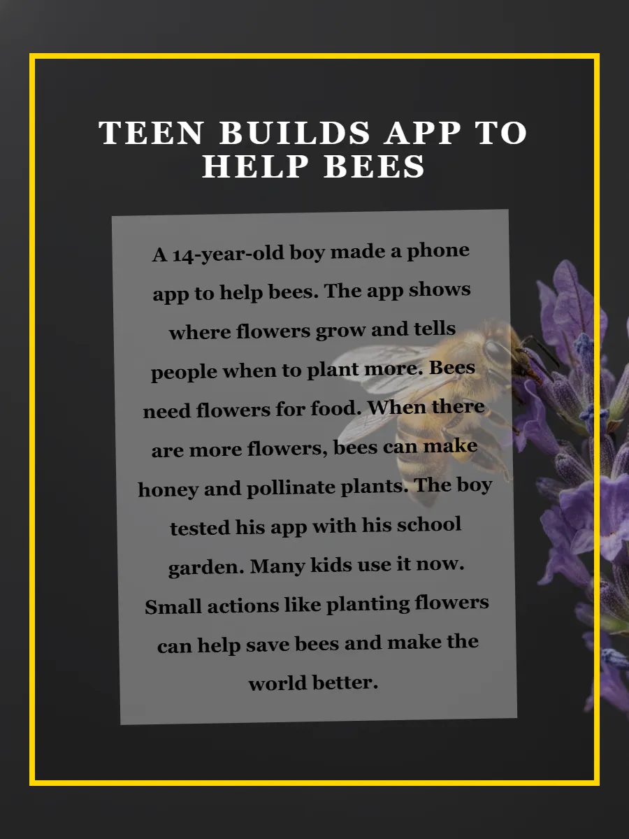 一个14岁男孩做了一个手机App来帮助蜜蜂。App显示花朵生长的地方,并告诉人们什么时候种更多花。蜜蜂需要花来吃食物。花越多,蜜蜂就能酿蜜并帮助植物授粉。男孩在学校花园测试了App。现在很多孩子在使用它。像种花这样的小行动能帮助拯救蜜蜂,让世界更好。