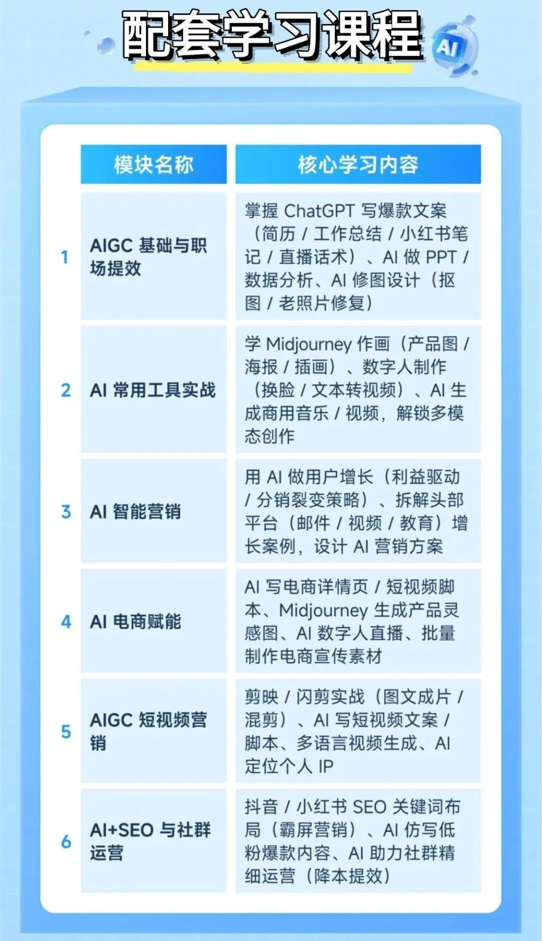 本次【AI营销师】认证课程共分为6 个核心板块: