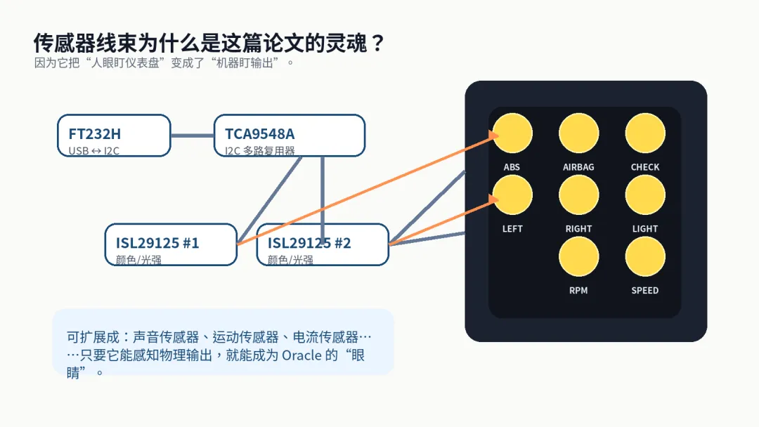 妙就妙在 Oracle 不是靠看源码,也不是靠软件埋点,而是靠可观察输出——比如 LED 指示灯、指针、显示器、继电器,甚至未来可以扩展到声音、功耗和振动。只要 ECU 有“表情”,这套方法就能去捕捉。