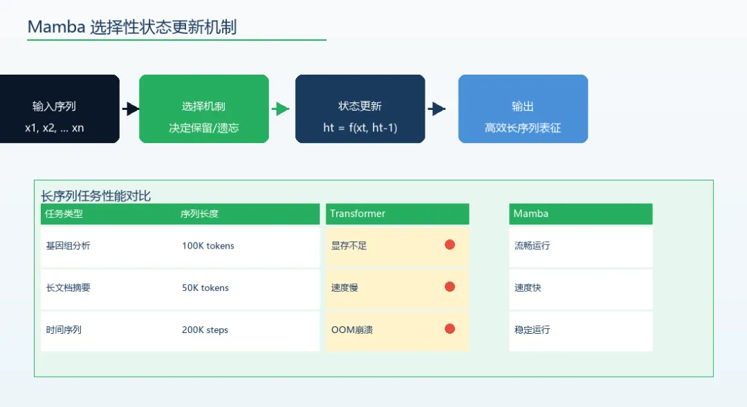 Transformer统治AI七年,但它的致命瓶颈也暴露了七年。Mamba是第一个真正从第一性原理出发的挑战者。但代价是:计算复杂度随序列长度平方增长——O(n2)。当你的序列从512个token扩展到4096个token时,计算量增加64倍;扩展到10万token时,计算量增加将近4万倍。这是物理限制,不是软件优化能解决的问题。这意味着:Transformer在处理「长上下文」时有根本性瓶颈。虽然Longformer、BigBird、RoPE等位置编码改进在工程层面缓解了这个问题,但它们本质上是补丁,没有改变O(n2)的复杂度上界。Mamba的核心洞察非常反直觉:与其让模型记住所有信息,不如让它学会主动遗忘。传统的循环神经网络(RNN/LSTM)的问题是:它们会压缩历史信息——随着序列变长,早期的信息会被逐渐遗忘。Transformer的问题是:记住了太多——每个token都要和所有历史token计算注意力,结果是算不动。Mamba引入的选择性扫描机制(Selective Scan)介于两者之间:模型对每个输入token动态决定——这条信息重要,我要选择性保留;那条信息无关,我要主动遗忘;另一条信息只管接下来几步,之后作废。这不是预设的遗忘策略,而是模型自己学到的。类比人类认知:你读一本书时,不是记住每个字的像素级细节,而是提取「语义」——谁做了什么决定、什么情节推进了、哪个伏笔后来回收了。Mamba让模型做类似的事情:选择性压缩、选择性保留、选择性遗忘。结果:在10万token的超长序列上,Mamba仍能保持稳定的推理速度;而同样长度的Transformer已经在显存里挣扎。在基因组学(染色体序列)、长文档分析、时间序列预测这些需要处理超长上下文的领域,Mamba展示了真实的能力跃迁。短文本任务两者无显著差异,Transformer够用硬件生态惯性:当前GPU适配不如TransformerHyena/RWKV/RetNet多路竞争,无明确赢家第一,在短文本任务上(大多数日常对话、写作、翻译场景),Mamba的优势并不明显。很多基准测试显示,两者差距在统计误差范围内。这意味着Transformer对80%的应用场景仍然够用,Mamba的用武之地目前还是长序列任务。第二,硬件生态的惯性。NVIDIA过去五年全力优化的是Transformer的矩阵运算——Tensor Core、FlashAttention、各类定制芯片,全都是为Transformer设计的。Mamba的选择性扫描需要完全不同的计算模式,在当前GPU上的实际运行效率往往低于理论值。第三,生态成熟度。Transformer有Hugging Face生态、vLLM推理优化、DeepSpeed训练全家桶,工具链极其成熟。Mamba的工具链(Jamba、Mamba2等变体)在快速迭代,但距离Transformer的易用性还有差距。还有一个值得关注的竞争者:Hyena(用长卷积替代注意力)、RWKV(线性Transformer)、RetNet(retention机制)——都在争夺「Transformer替代者」的位置,目前没有明确赢家。Mamba是近五年来最有原创性的AI架构创新之一。它不是简单地在Transformer基础上打补丁,而是从第一性原理出发,重新思考「如何高效处理长序列」。但它不会「取代」Transformer,更可能的方向是共存——短任务用Transformer省心(生态成熟),长任务用Mamba高效(架构优势)。架构之争,本质上是场景之争。最值得关注的是混合架构的趋势:有些模型已经在用Transformer处理短上下文、用Mamba处理长上下文,各取所长。未来的AI模型可能不是「选哪个架构」,而是「何时用哪种机制」。三、DiT架构:视频生成正在跨越恐怖谷
