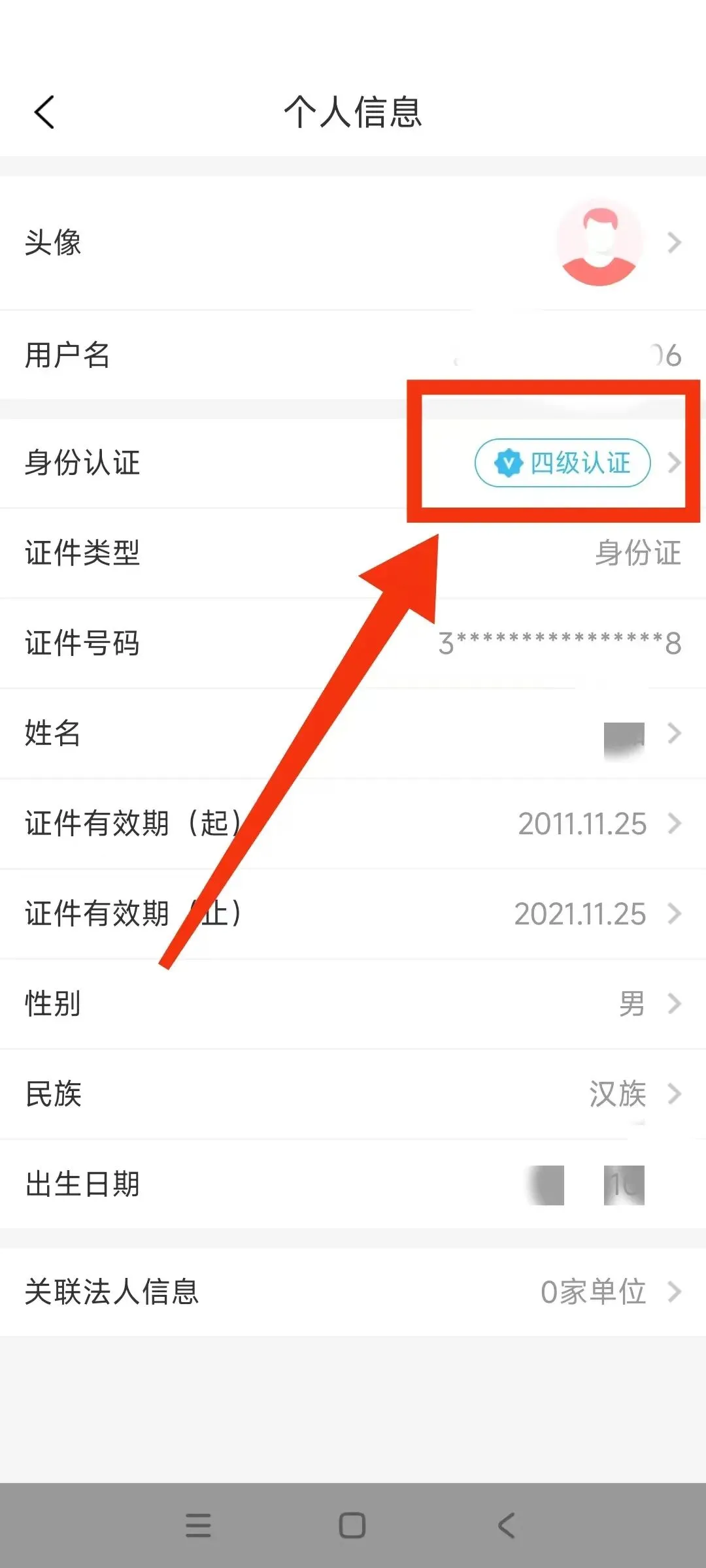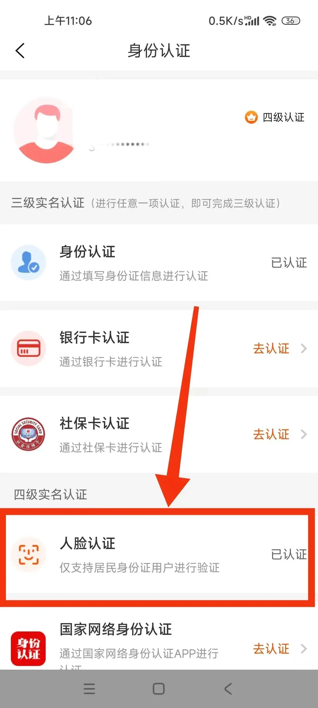 第四步: 如果上图显示的是“三级认证”点击“人脸认证”即可达到四级认证。