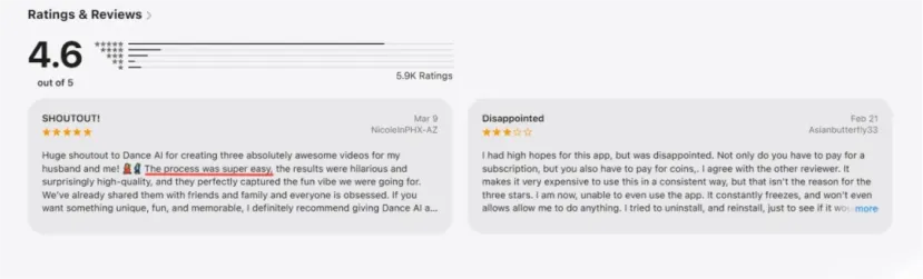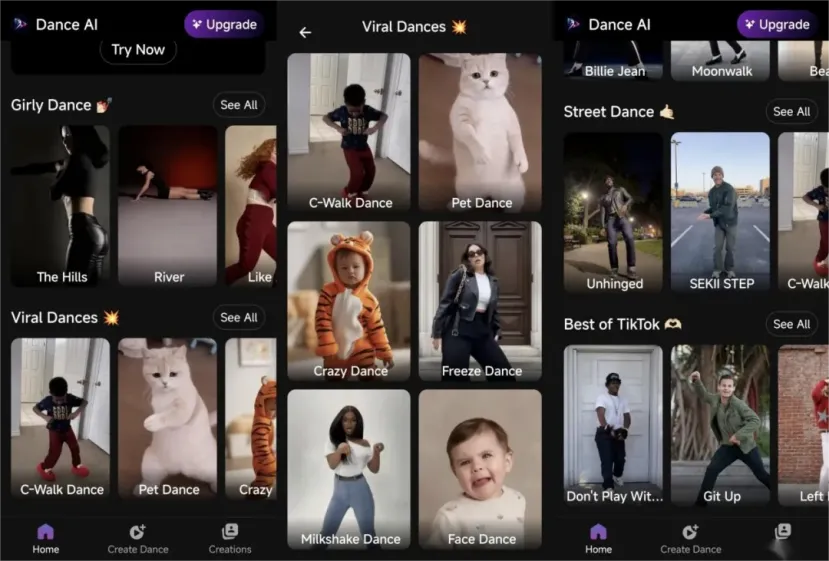 Dance AI 这类产品的出现,就是一个很典型的信号。它在 App Store 和 Google Play 上的描述非常直接:上传一张照片,就能把自己、朋友、小孩或宠物做成可分享的舞蹈视频,目标场景就是 TikTok 和社交平台传播。换句话说,它卖的不是“专业视频生成工具”,而是“帮普通用户一键参与当下最火内容”的能力。