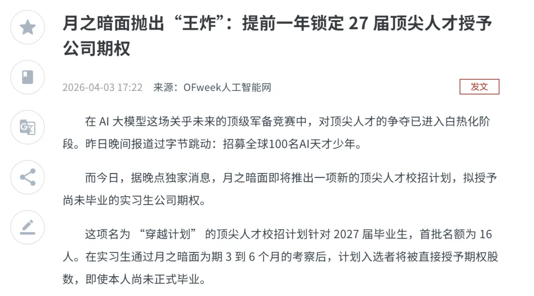 有消息称,月之暗面即将推出名为“穿越计划”的顶尖人才校招计划,专门针对2027届毕业生,首批仅开放16个名额,堪称“百里挑一”的顶级机遇。