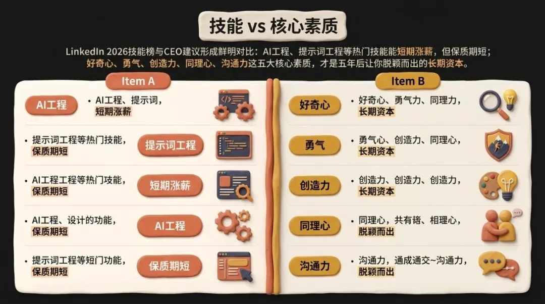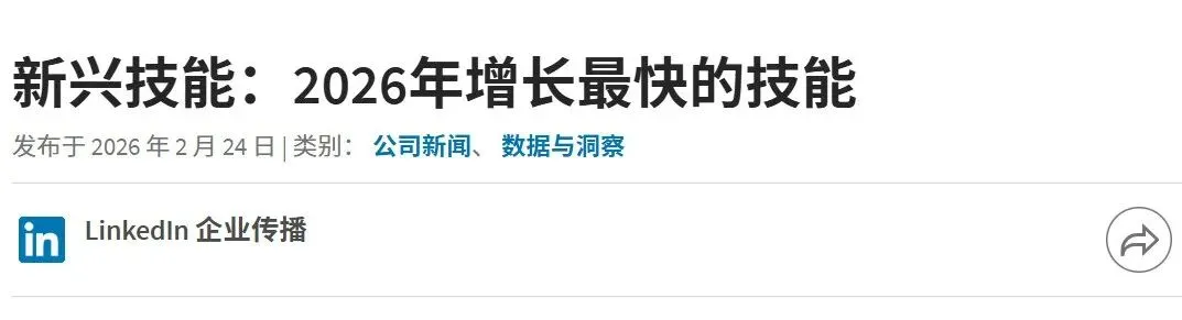 一个是2月刚发布的“ 2026 年增长最快技能榜”,前几名几乎全是 AI 相关:AI Engineering、Prompt Engineering、Model Tuning。