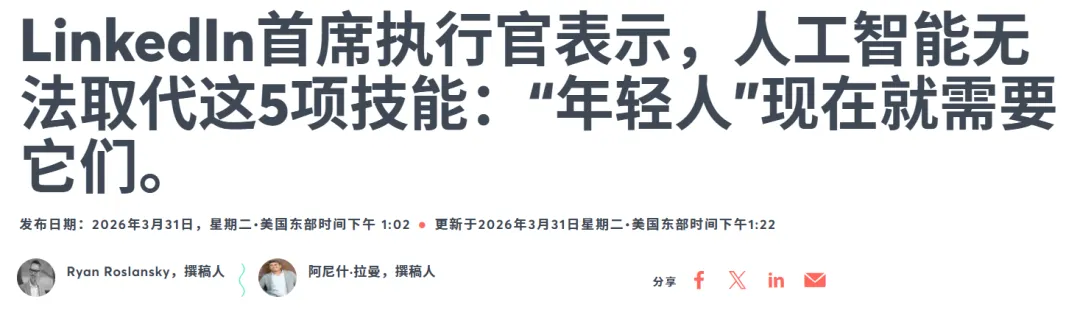 另一个是同年3月,LinkedIn CEO Ryan Roslansky 被问到“年轻人最该学什么?”,他一个 AI 技能都没提,只说了五个词: