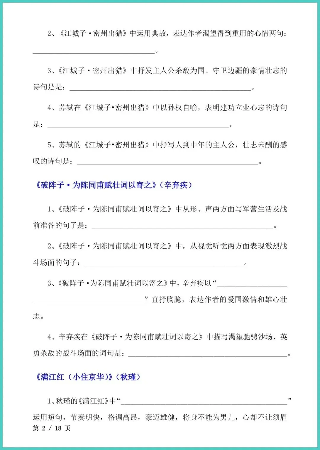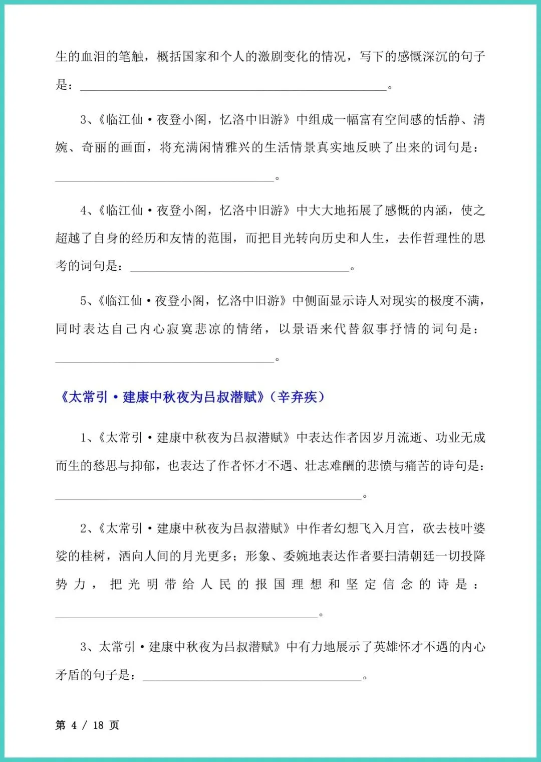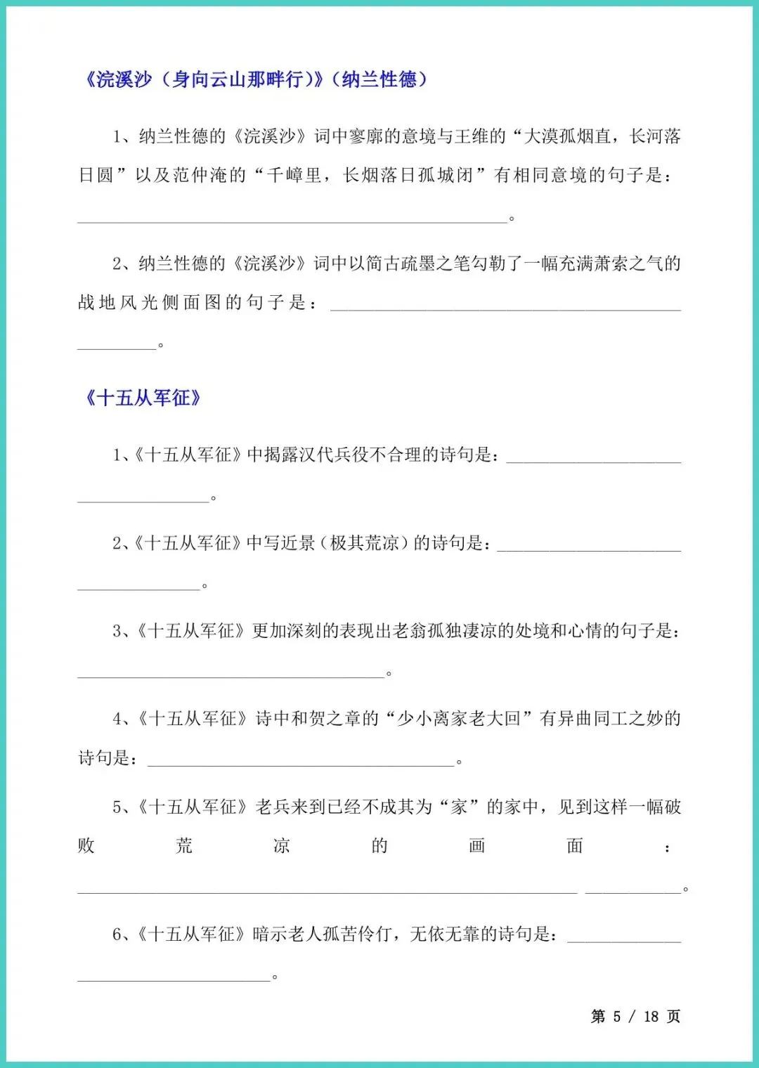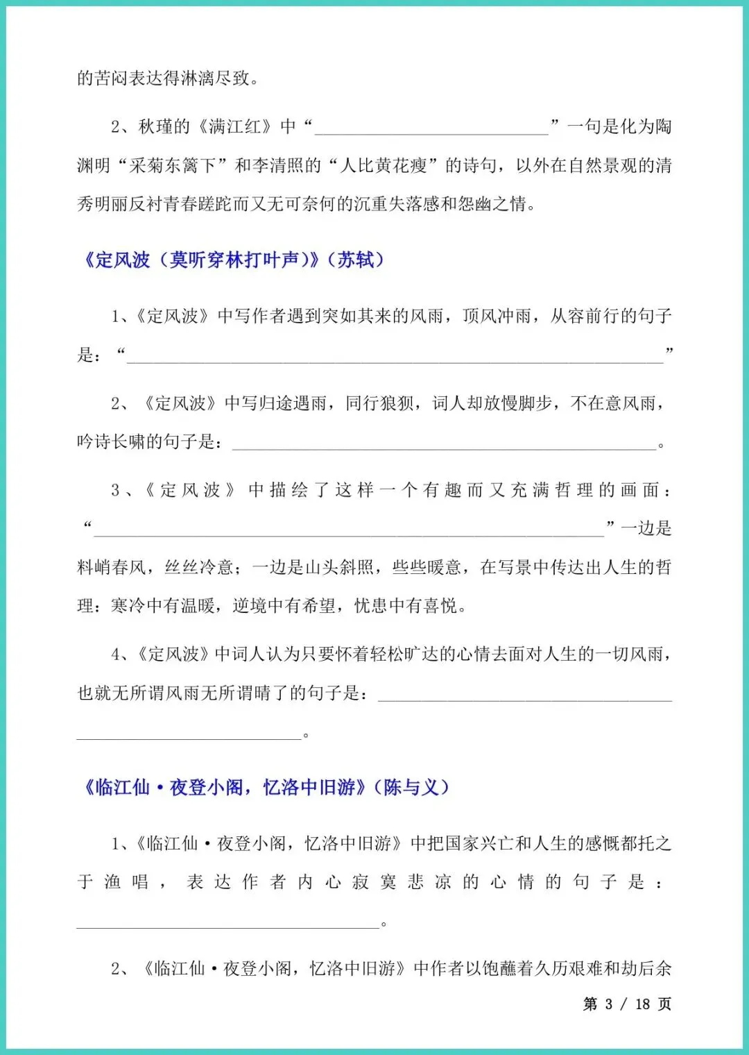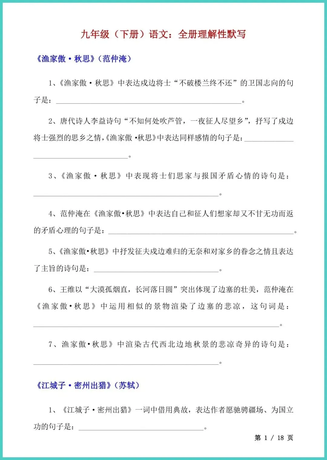 24年春部编版九年级下册语文《全册理解性默写》新鲜出炉,18页精华一次打包!涵盖所有必背古诗文、重点段落、易错字词,按课标顺序编排,留白处即默写区,答案隐藏扫码即看。每天10分钟,孩子边记边写,理解默写双巩固,考场默写不丢分!期末冲刺、中考抢分都靠它,家长们速速打印,让孩子睡前练一页,早读再复盘,默写满分稳到手!