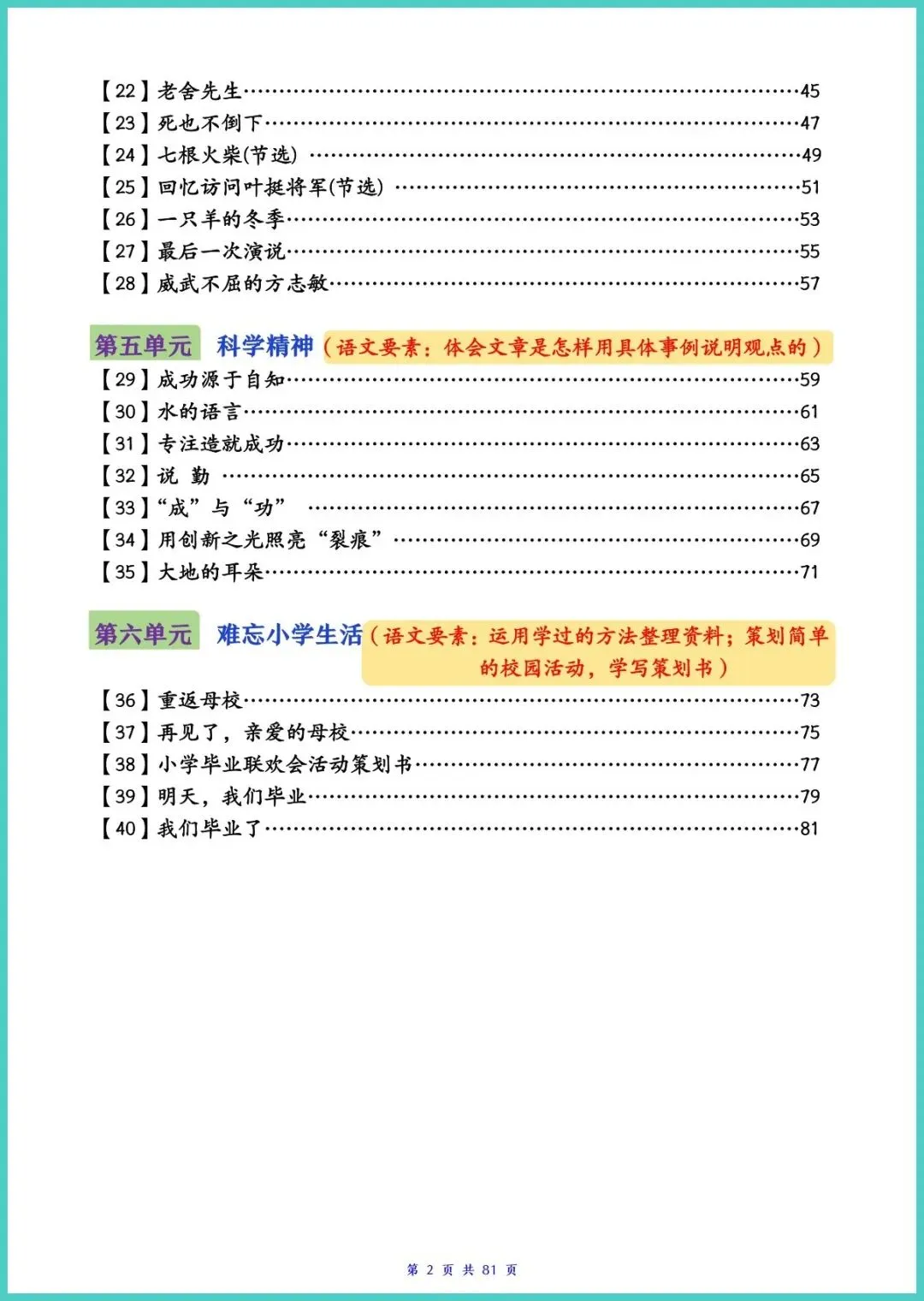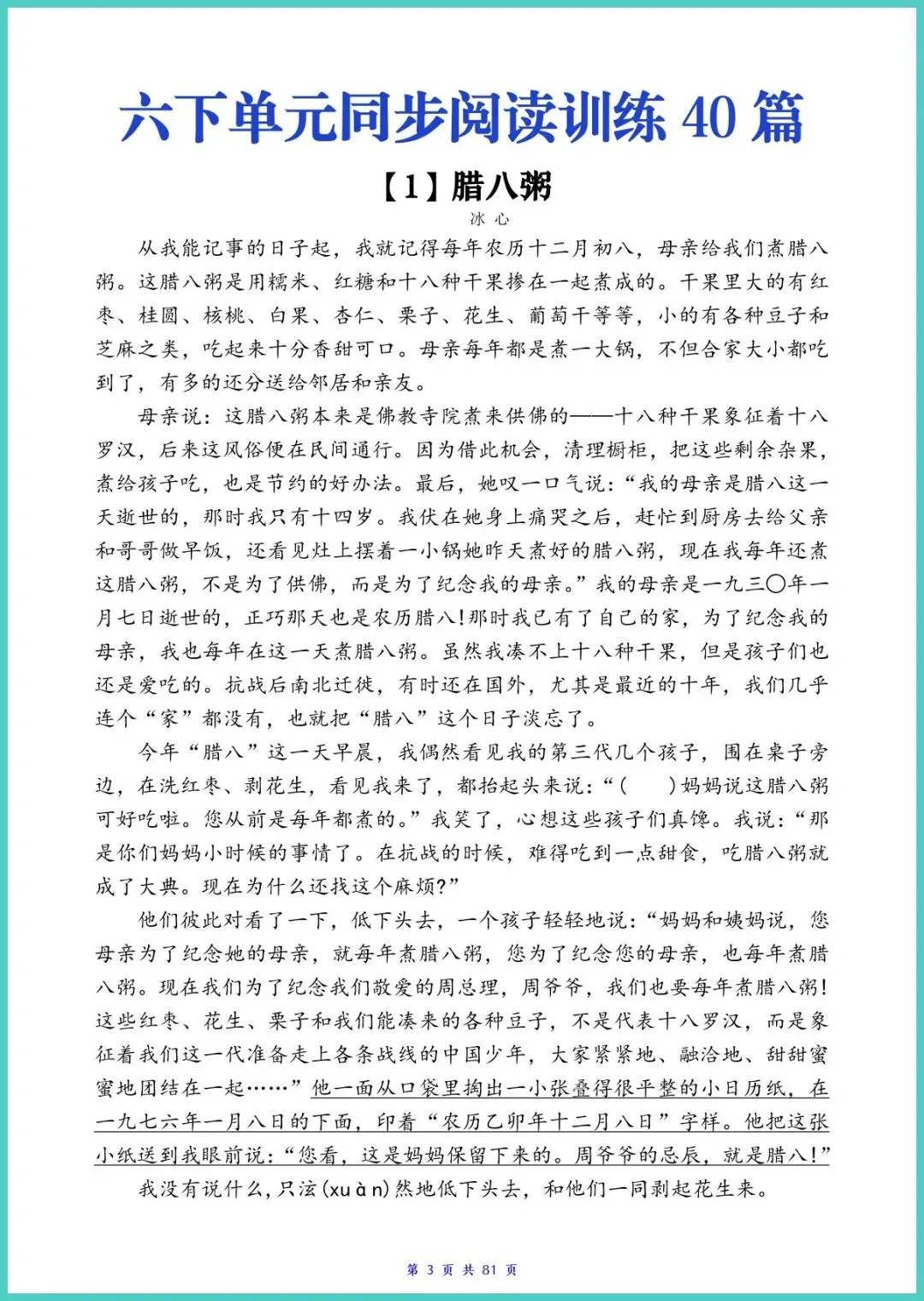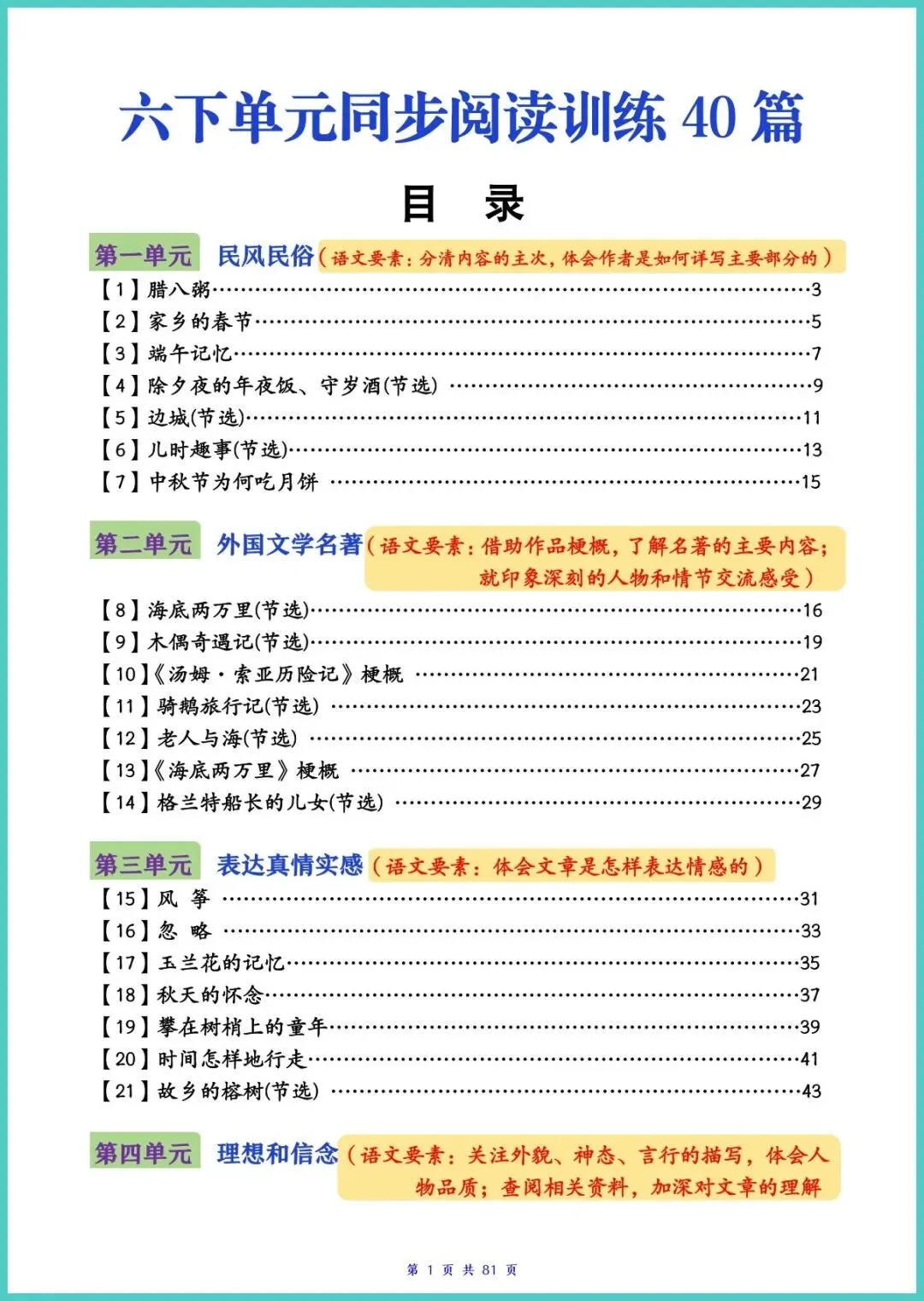 24春部编版六年级下册语文《单元同步阅读理解训练40篇》全册81页电子版来了!40篇阅读紧贴课本单元主题,涵盖写人、记事、写景、说明文、文言文等常考文体,每篇配“文脉梳理考点突破答题模板范文答案”,带孩子三步读懂文章、踩点得分。每天15分钟,练速度、攒技巧、提语感,期末阅读少丢分!需要的家长赶紧打印,让孩子趁周末刷起来!