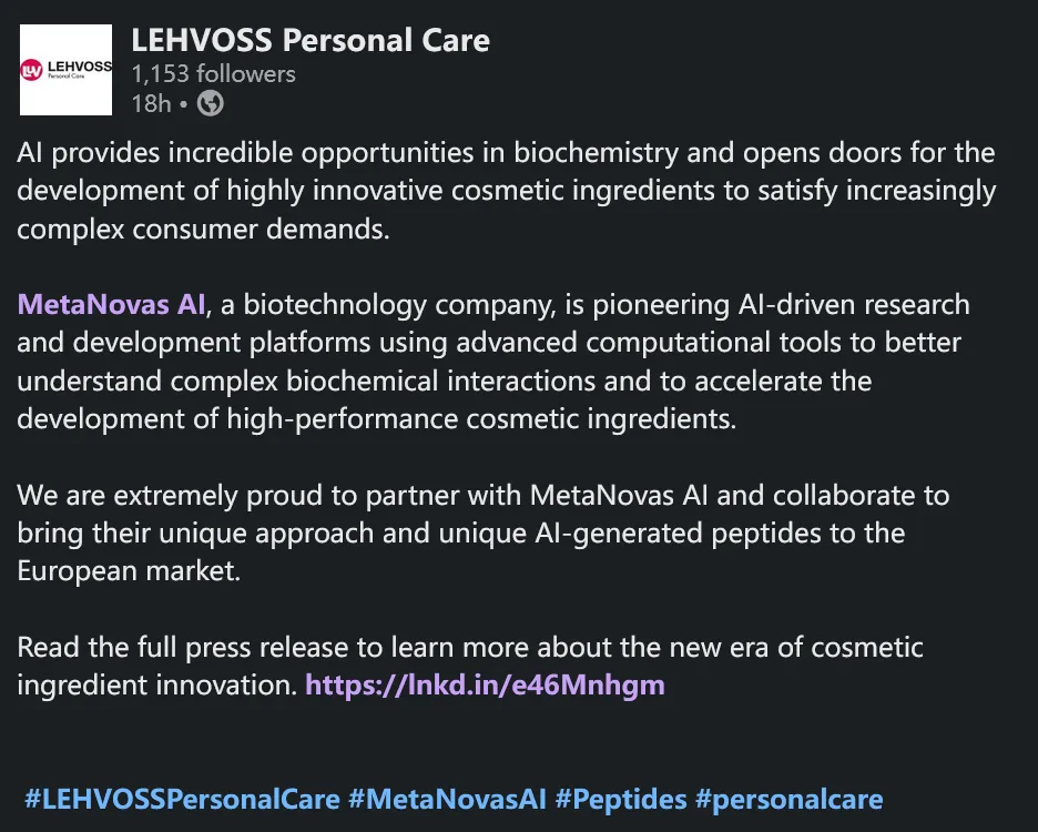 LEHVOSS成立于1894年,总部位于德国汉堡,是欧洲领先的特种化学品和原料分销商,在个人护理领域拥有深厚的市场资源和客户网络。此次合作标志着MetaNovas AI的AI设计创新原料从亚太和北美市场正式拓展至欧洲,进一步完善了全球化商业布局。