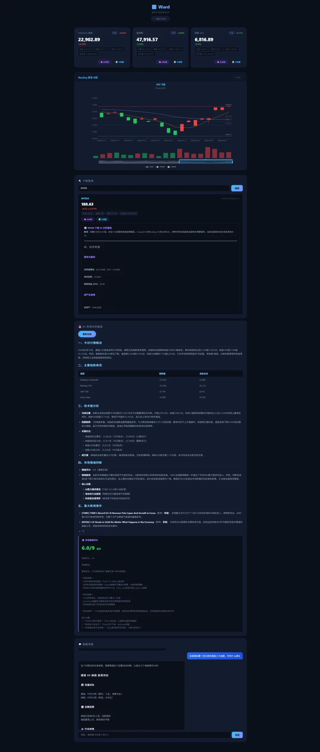 我投资美股多年,回报率一直不太行。信息渠道太多,分不清哪些该看、哪些是噪音。干脆自己动手做了个工具:Ward。基于市场数据和 AI 大模型,把实时行情、技术分析、AI 解读、即时问答整合在一起,降低决策成本。