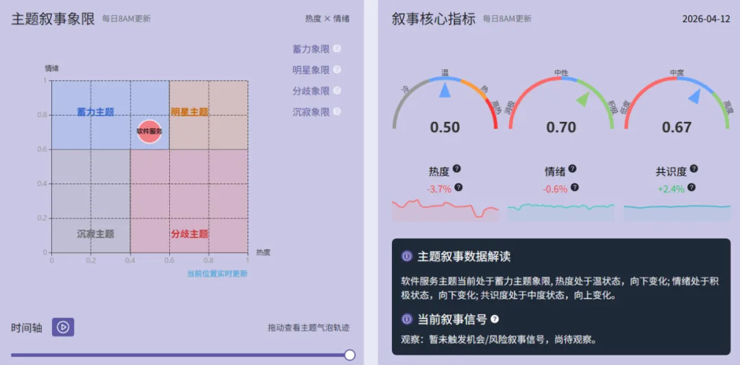 大模型公司Anthropic在测试中发现,预览版的“神话”大模型已具备顶级网络安全专家的水准。为避免风险,Anthropic决定先将访问权限分享给40多家关键公司和组织,当然不包括政府部分和白宫。这种谁也看不见的突飞猛进当然会制造恐慌叙事,美股网络安全概念就延续了暴跌模式。市场似乎忘记了Anthropic自己都是用外部网安软件,还在前期出现了各种管理、泄漏问题。 从主题蜂“软件服务”的主题走势看,主题整体的叙事还是受到了压制。
