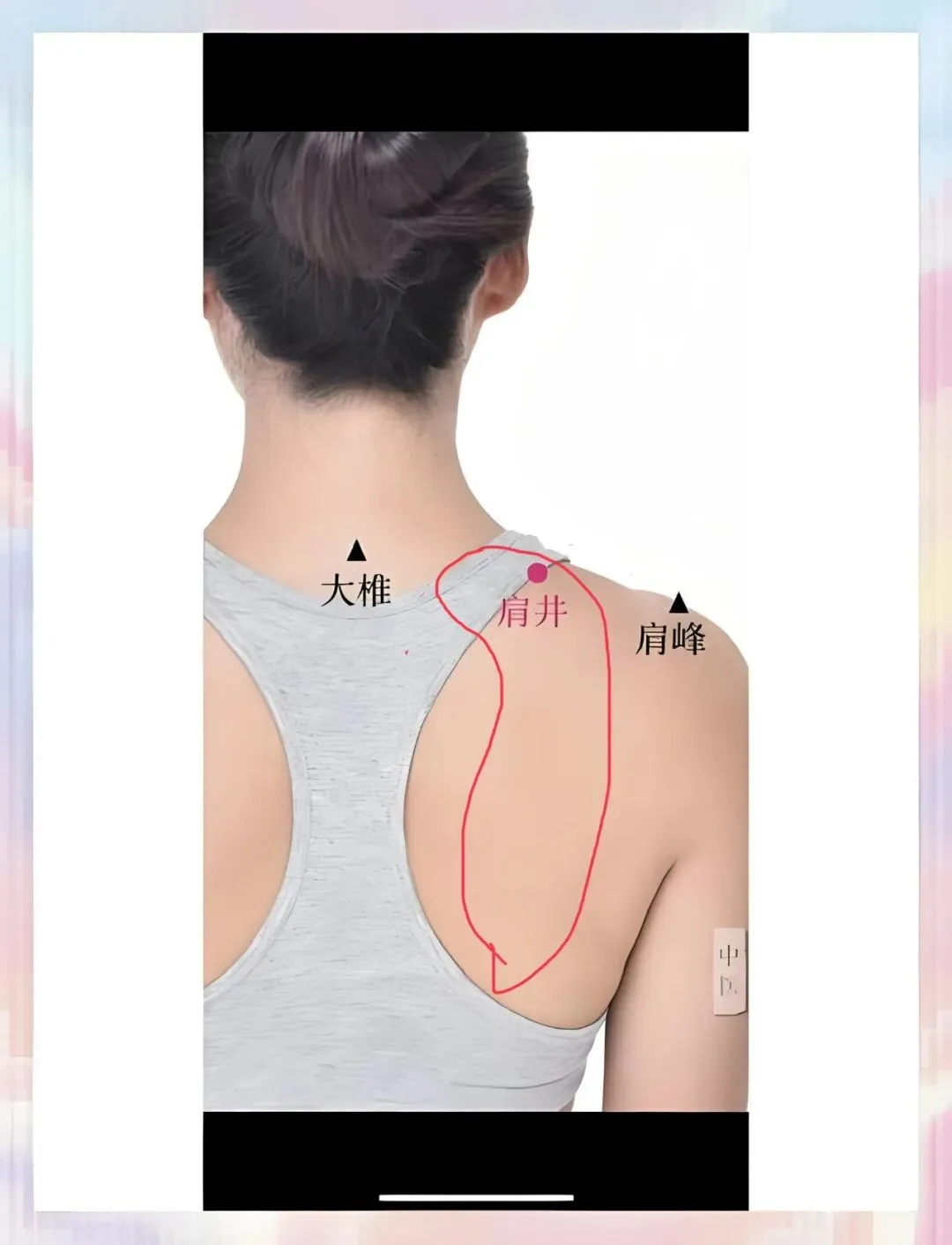 •位置:你标的“肩井”附近 + 肩胛骨内侧这一大片