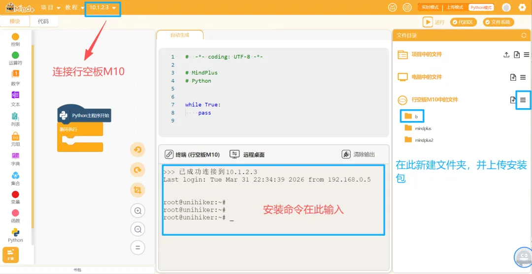 在Mind+软件中打开右侧“文件系统”创建文件夹“b”(随意),然后将准备好的安装包拖进文件夹中,如上图。