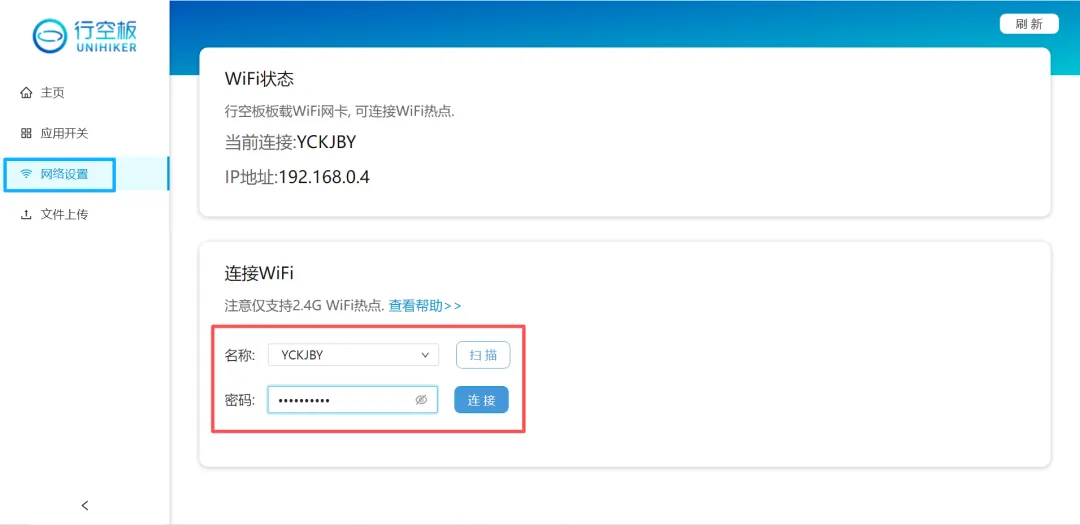 •点击扫描WiFi,选择你的2.4G WiFi热点,输入密码后连接;