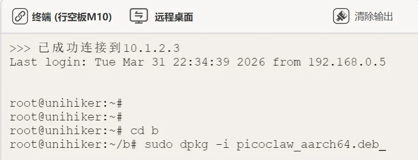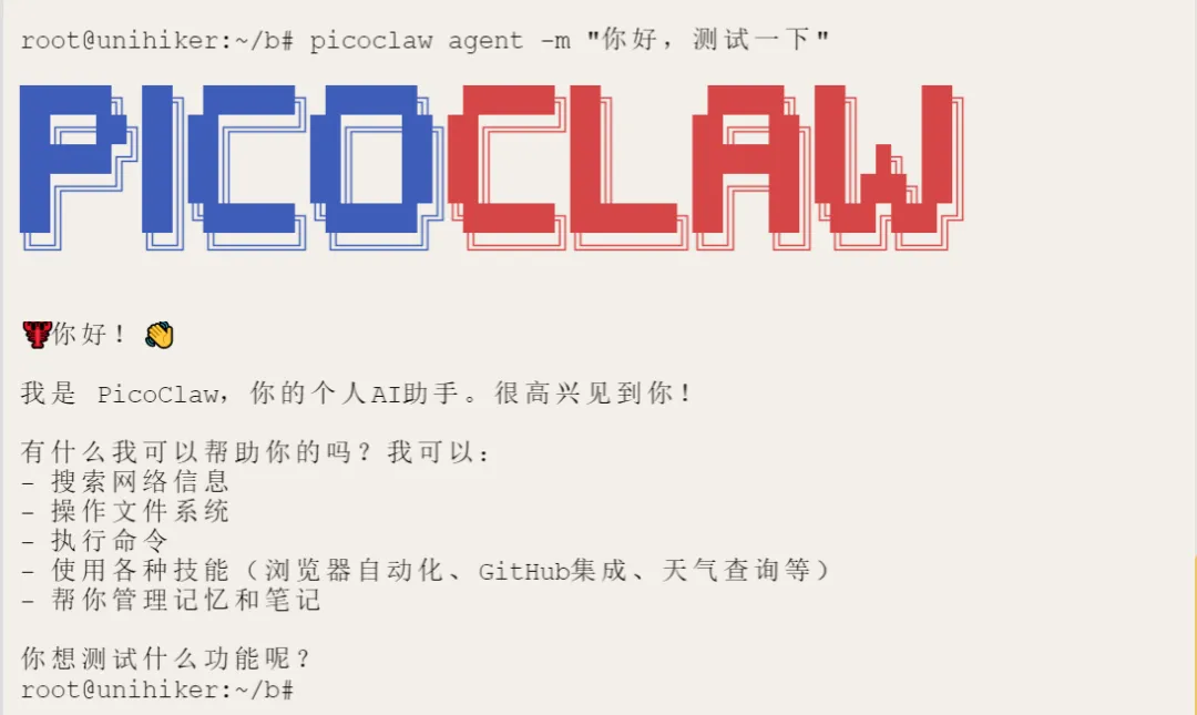 1.进入文件夹 bcd b 2.安装picoclaw sudo dpkg -i picoclaw_aarch64.deb 3.测试是否安装成功(出现版本和命令说明即成功) picoclaw |