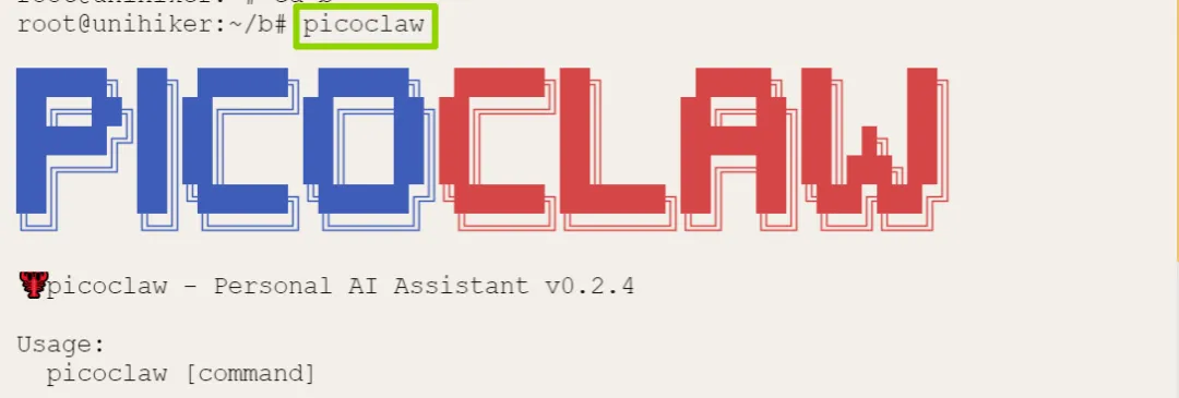 成功标志:终端输出picoclaw - Personal AI Assistant v0.2.4及各类可用命令。