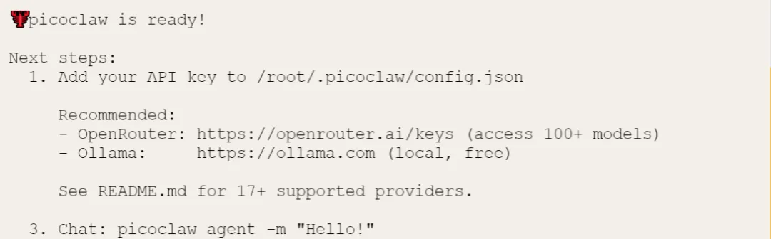 成功标志:终端输出picoclaw is ready!,并在~目录生成.picoclaw隐藏文件夹(内含核心配置文件config.json)。